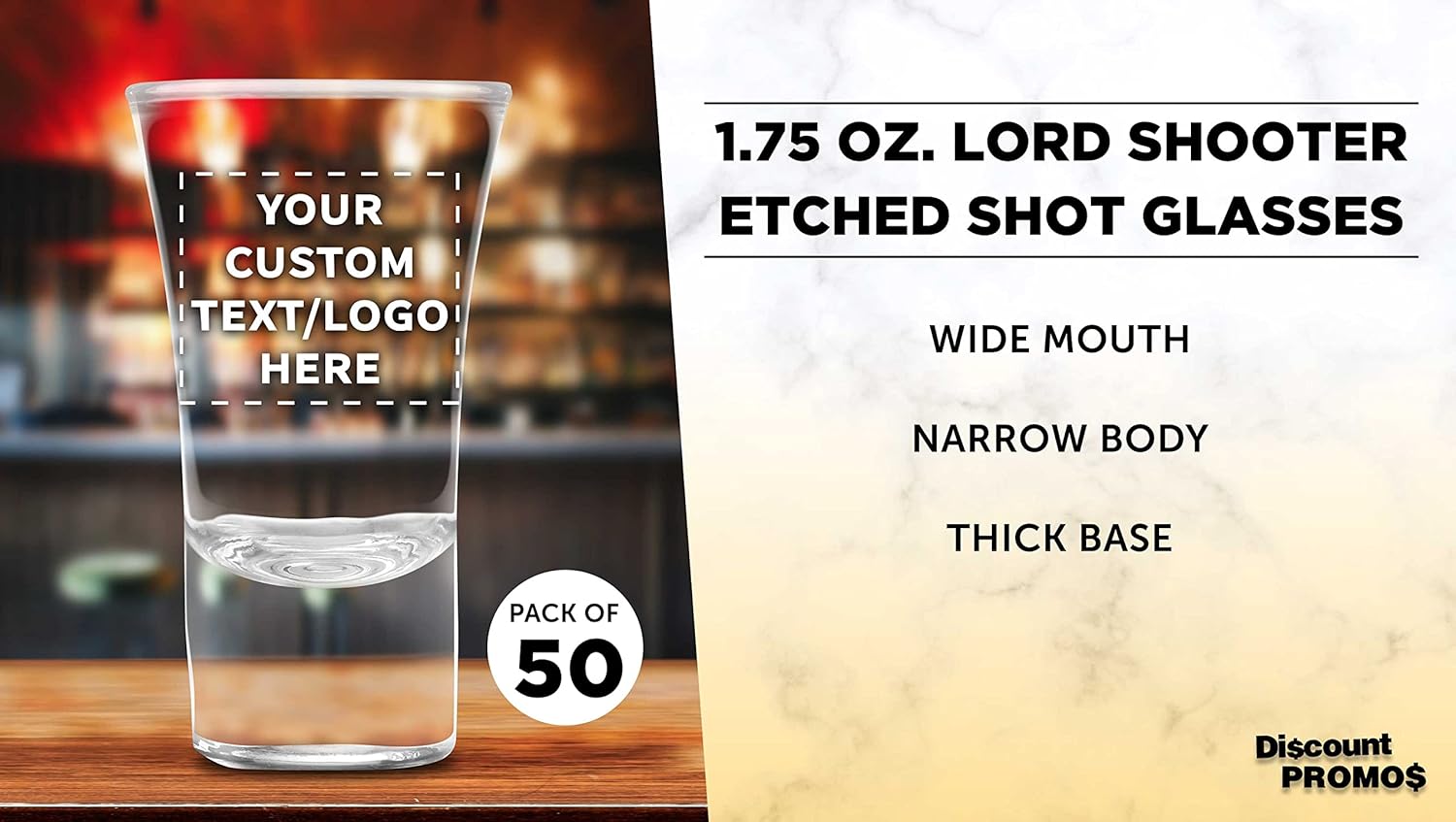 Custom 2 oz. Lord Shooter Etched Shot Glasses, 50 pack, Personalized Text, Logo, 21st Birthday Party, Lounge Glassware, Clear