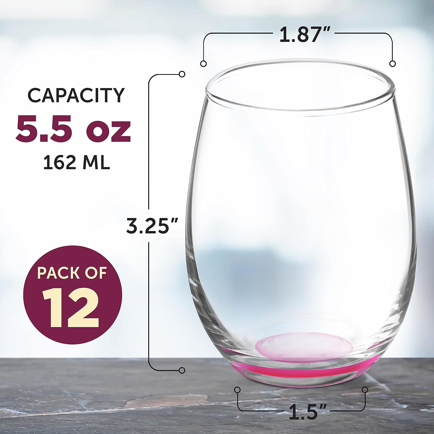 DISCOUNT PROMOS Stemless Wine Glasses by ARC 5.5 oz. Set of 12, Bulk Pack - Perfect for Hotel, Bar, Restaurant or Lounge - Pink