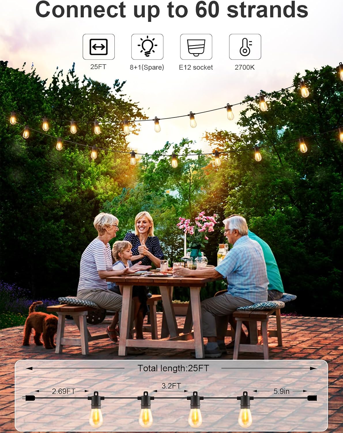 - Wide Application: Perfect for outdoor patio, cafe, bistro, backyard, yard, porch, gazebo, balcony, Outside, garden, party, wedding decoration. Connect up to 60 strands of 25 FT string lights. Please contact us if you have any problem