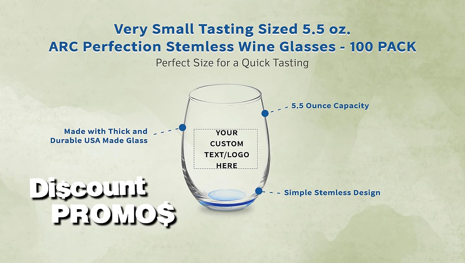 Custom Stemless Wine Glasses by ARC 5.5 oz. Set of 100, Personalized Bulk Pack - Perfect for Hotel, Bar, Restaurant or Lounge - Blue