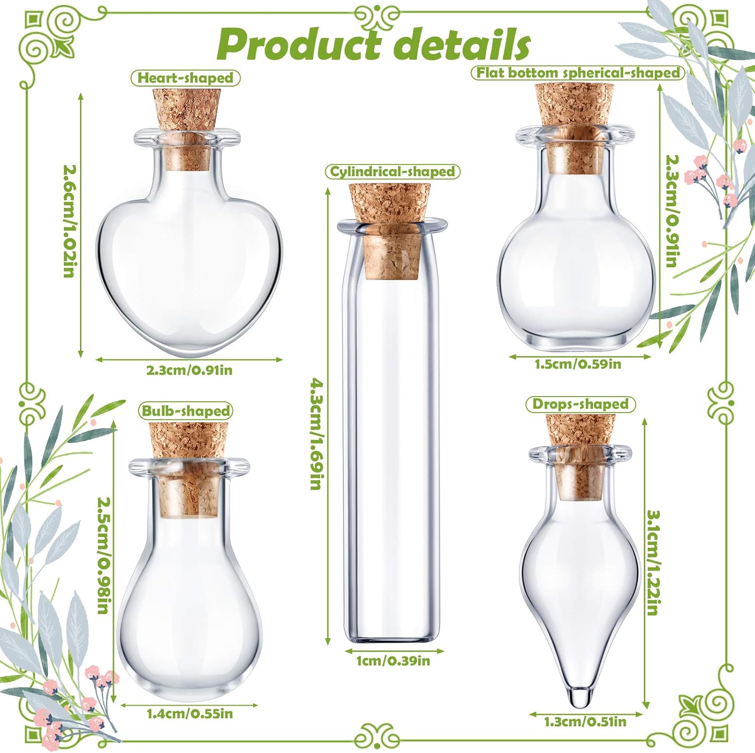- Details: the mini glass bottles capacity is about 2 ml; Different sizes with different shapes; Bulb-shaped is 0.98 x 0.55 inch /2.5 x 1.4 cm, drops-shaped is 1.22 x 0.51 inch /3.1x 1.3 cm, heart-shaped is 1.02 x 0.91 inch/ 2.6 x 2.3 cm, cylindrical-shaped is1.69 x 0.39 inch/ 4.3 x 1 cm, flat bottom spherical-shaped is 0.91 x 0.59 inch/ 2.3 x 1.5 cm; They are really tinny bottles by handmade, please check the size carefully before you buy them