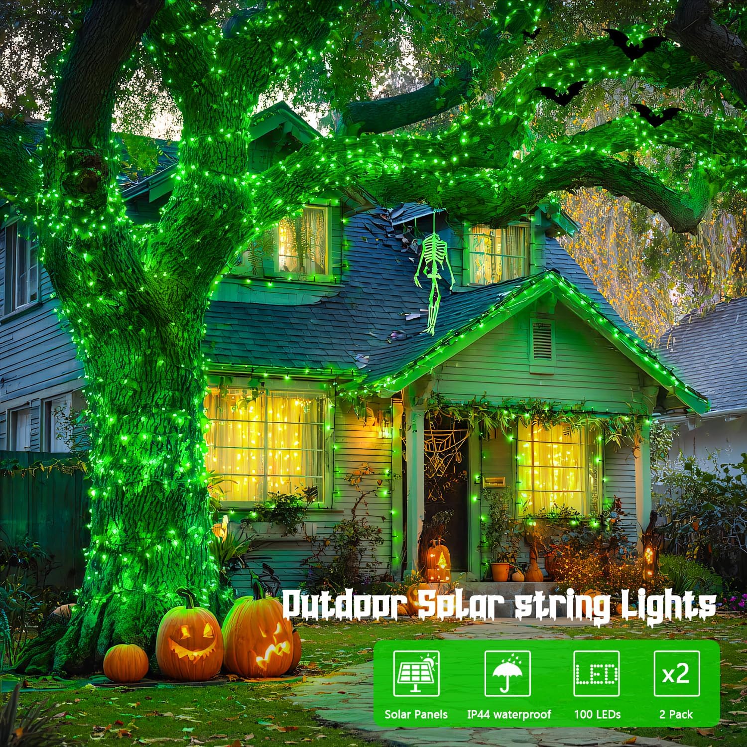JMEXSUSS 2 Pack Green Solar Lights for Halloween, Each 100 LED 33 FT Green Christmas Lights Outdoor Waterproof, 8 Modes Solar Halloween Light for Outside Christmas Tree Yard Garden Decor