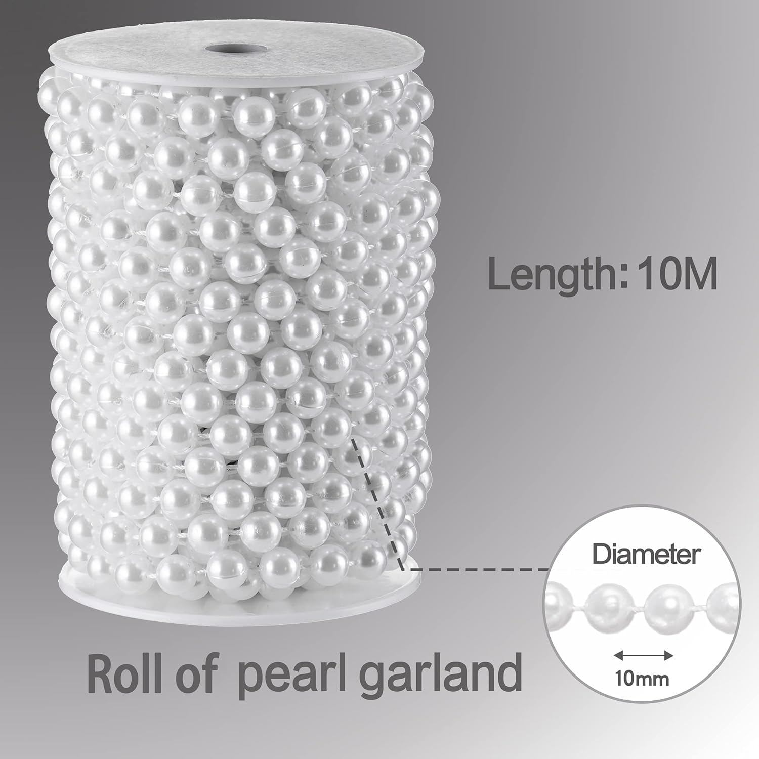 Craft String Pearls 10MM Pearl Bead, 33 Feet White Faux Pearl Garland Spool Roll Strand Wedding Party Decoration, Christmas Tree Decorations
