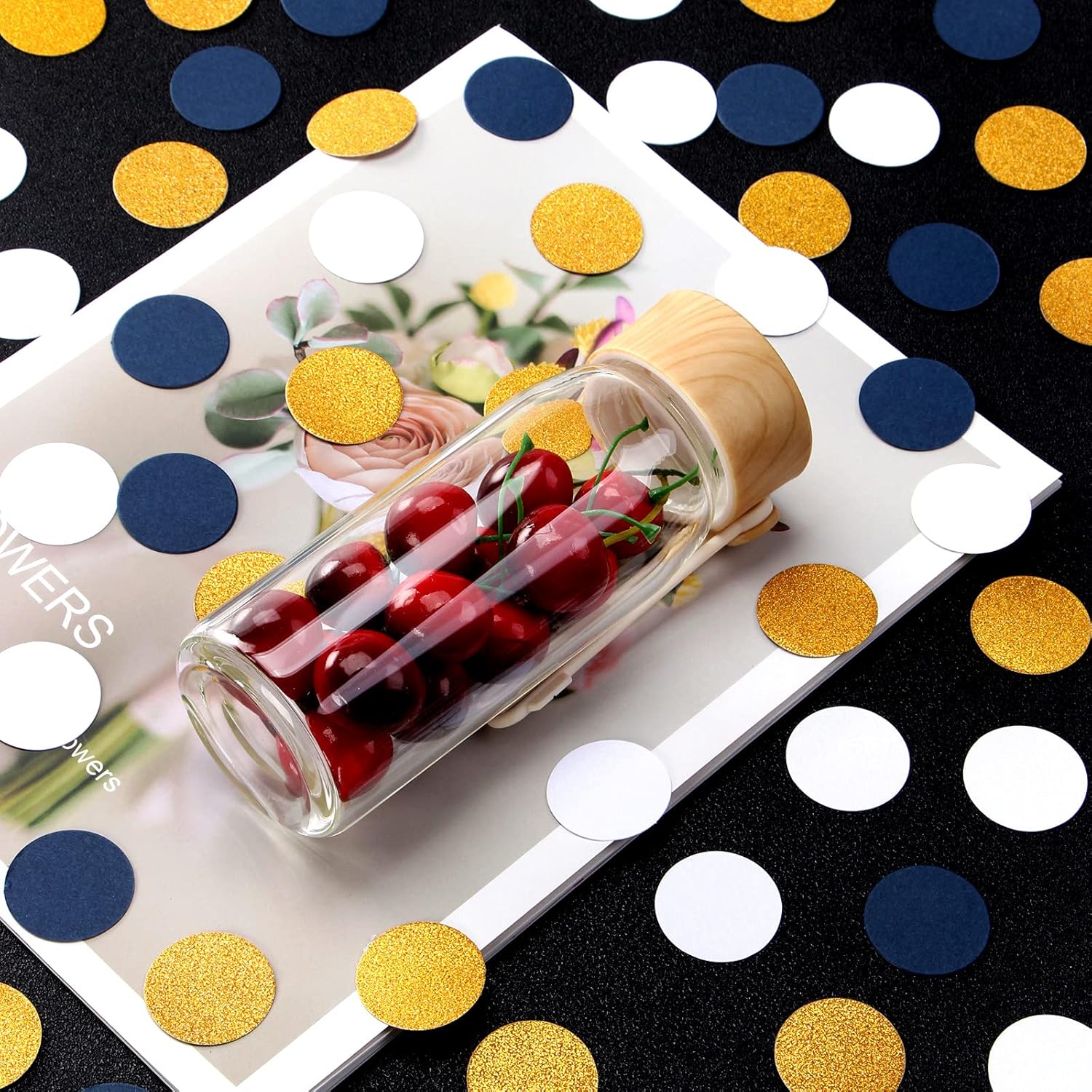 - The navy blue white gold confetti can be used as cupcake toppers or decoration on the party cake pop stand. Just adding the sprinkles confettis around the table is good too. It will let your table will look more vivid.