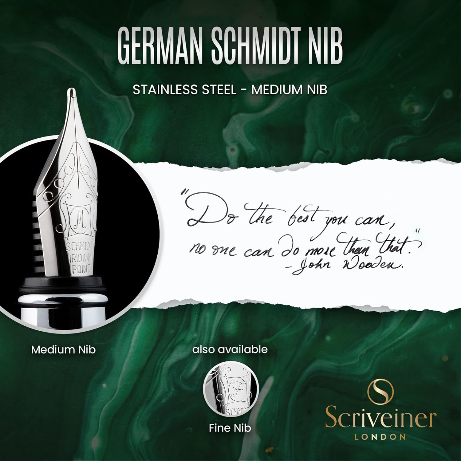 Scriveiner British Racing Green Fountain Pen - Stunning Luxury Pen with Chrome Finish, Schmidt Nib (Medium), Best Pen Gift Set for Men & Women, Professional, Executive, Office, Nice Pens