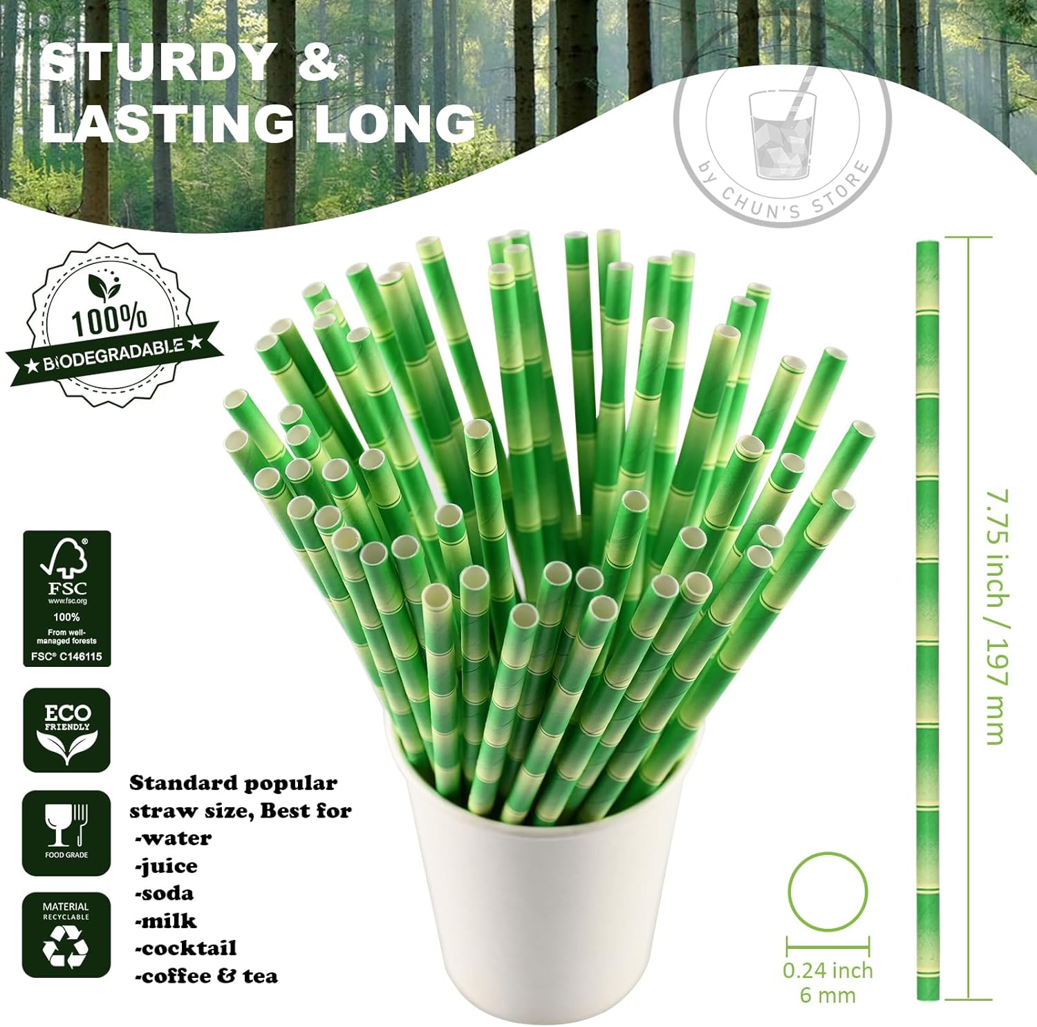 - Made from food grade paper, glue and ink. The paper of our straws are made from wood pulp originated from well-managed forest (FSC No.C146115).