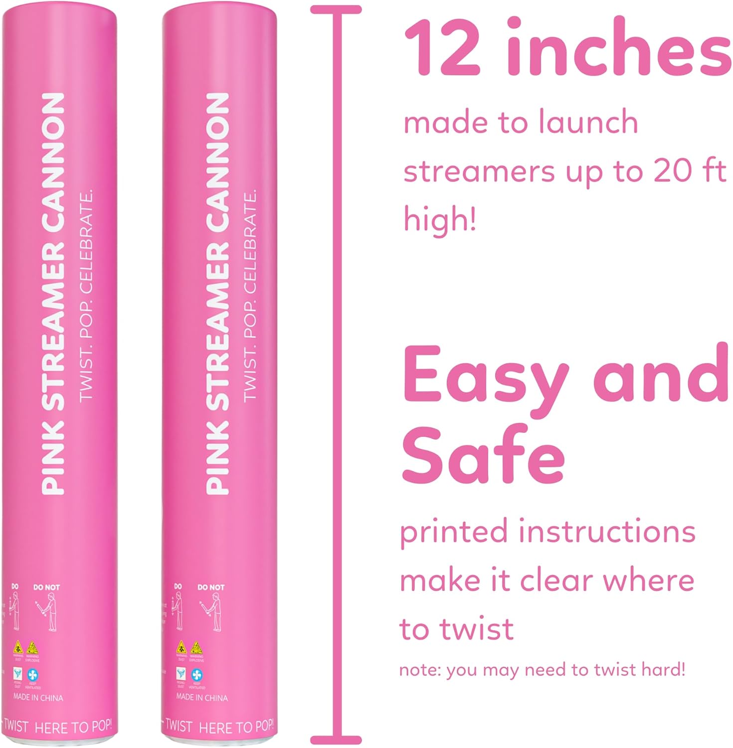 Pink Streamer Cannon Poppers | 2 Pack | Biodegradable Pink Streamers | TUR Party Supplies | Up to 25ft | Giant (12”) | Party Poppers for Graduation, Birthdays, and Bachelorette & Princess Parties