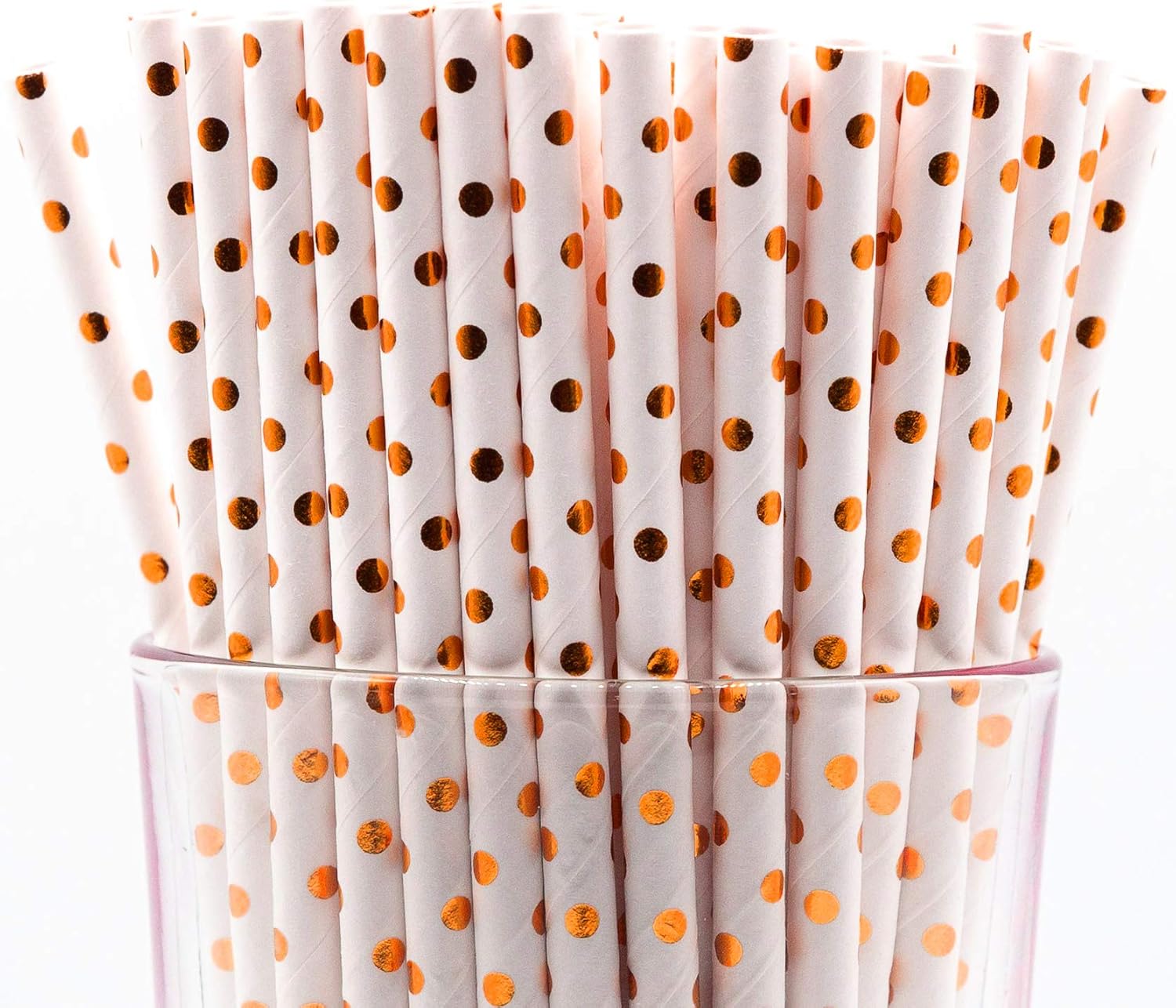 Pack of 900 Rose Gold Polka Dot Foil Biodegradable 4-Ply Paper Drinking Straws (Compostable, Non-toxic, BPA-free)