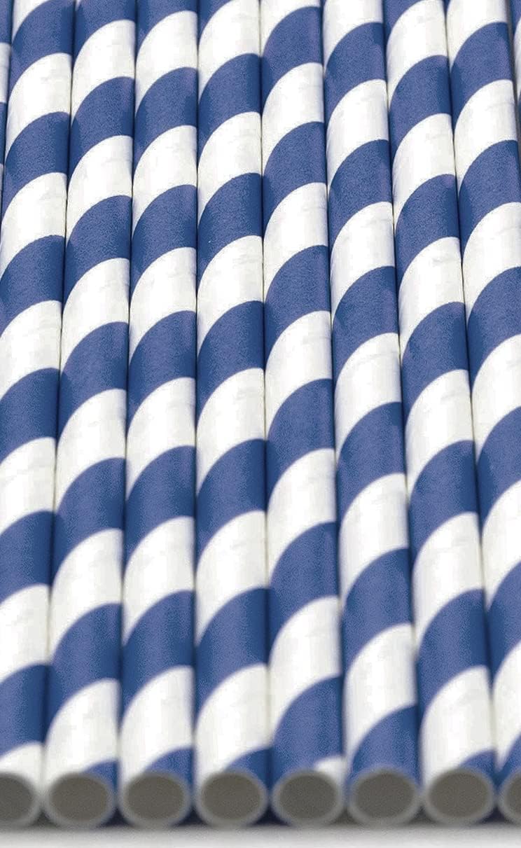 - Pack of 900 Navy Blue Swirls wrapped paper straws that are 7.75” long and have a diameter of 0.25”. Made with 4-ply paper which translates into thicker and more resilient straws that won’t wilt or change shape in both hot and cold drinks.