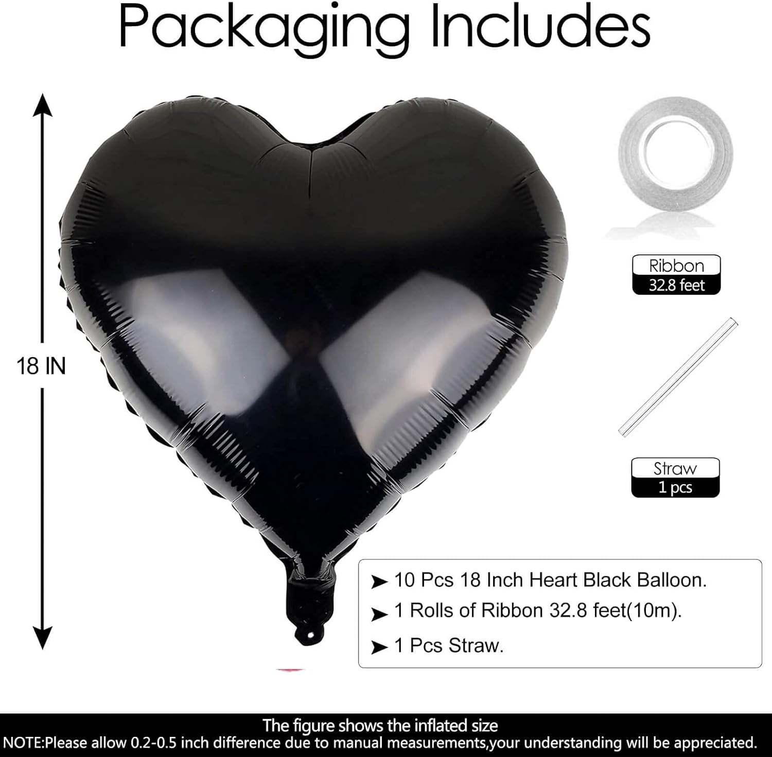 - Package Included:10Pcs 18 inch Black Heart Balloons (uninflated) + 1pcs Straw +1pcs 32 foot Ribbon Roll
