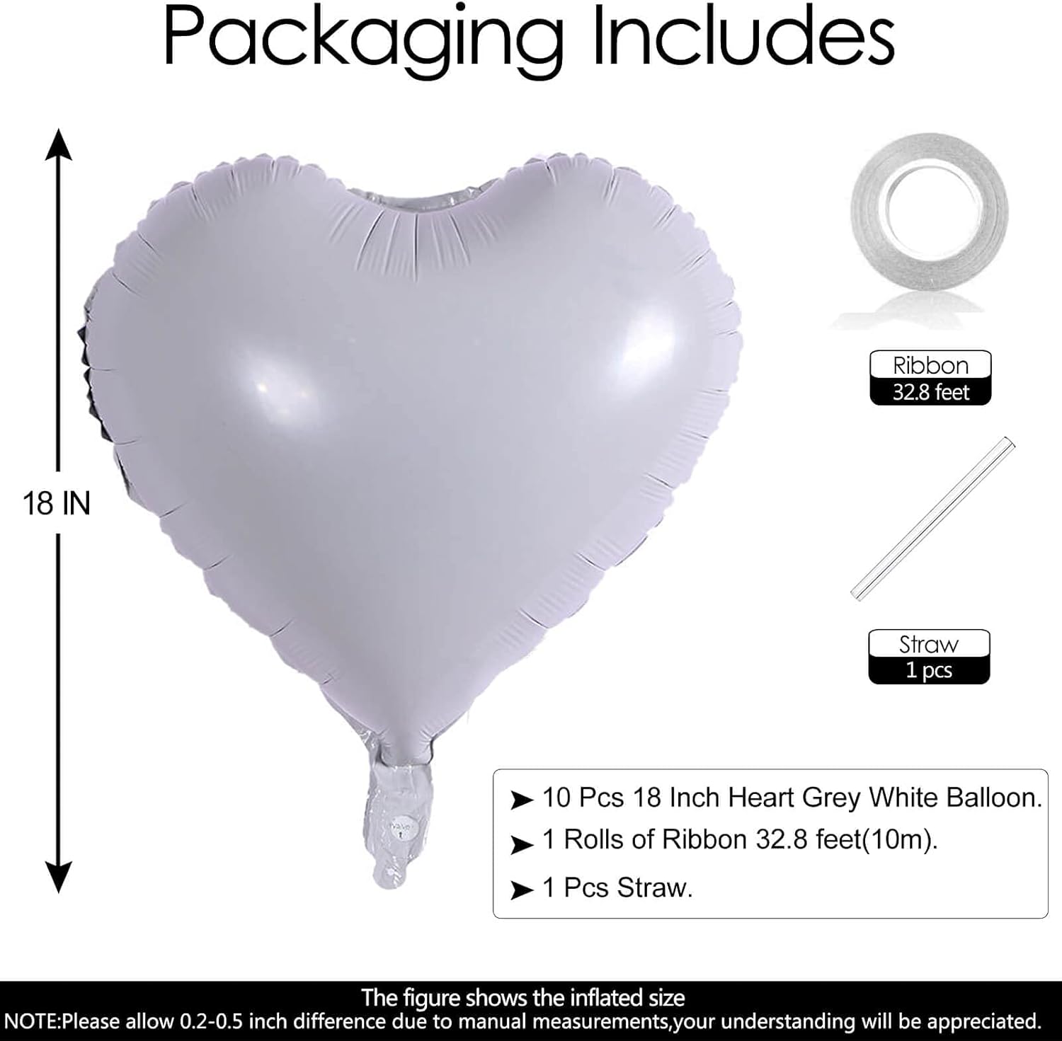 - Package Included:10Pcs 18 inch Grey White Heart Balloons (uninflated) + 1pcs Straw +1pcs 32 foot Ribbon Roll