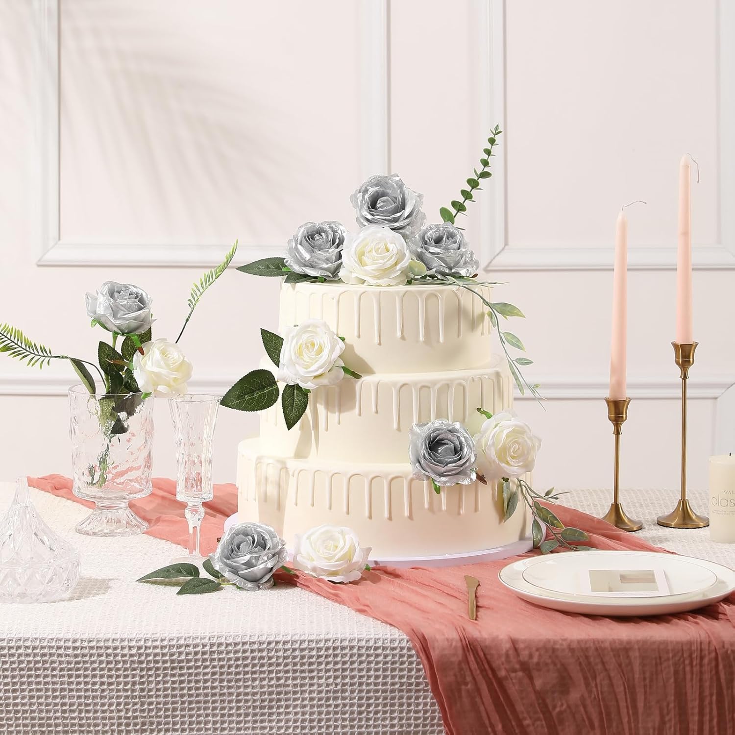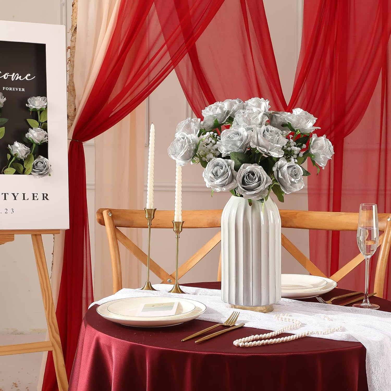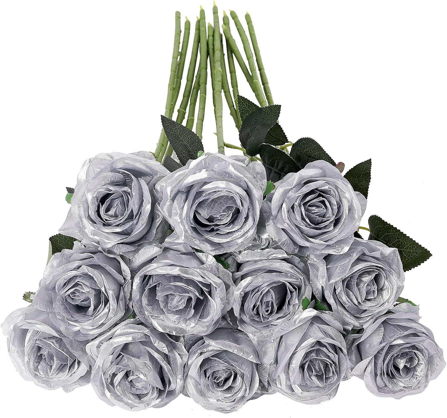 Tifuly Silver Roses Artificial Flowers -12Pcs Realistic Single Long Stem Fake Silk Roses Bouquet for Party Home Wedding Centerpiece Hotel Office Decor