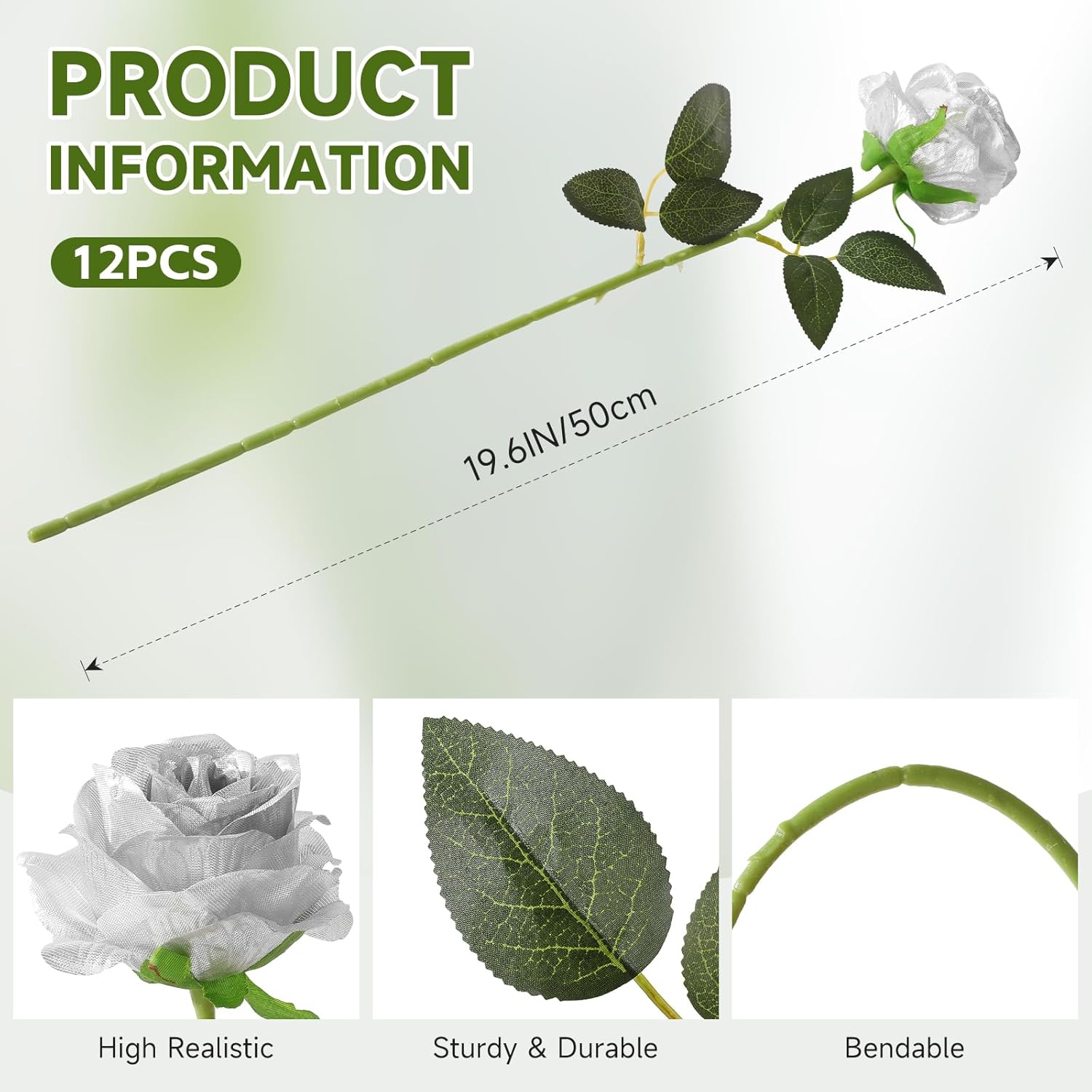 - Size: Each fake rose length is 1.64 ft/ 50 cm, flower 3.15 inch/ 8 cm in diameter, with realistic green leaves; Package: 1 Pack included 12 pcs artificial roses flowers in bulk