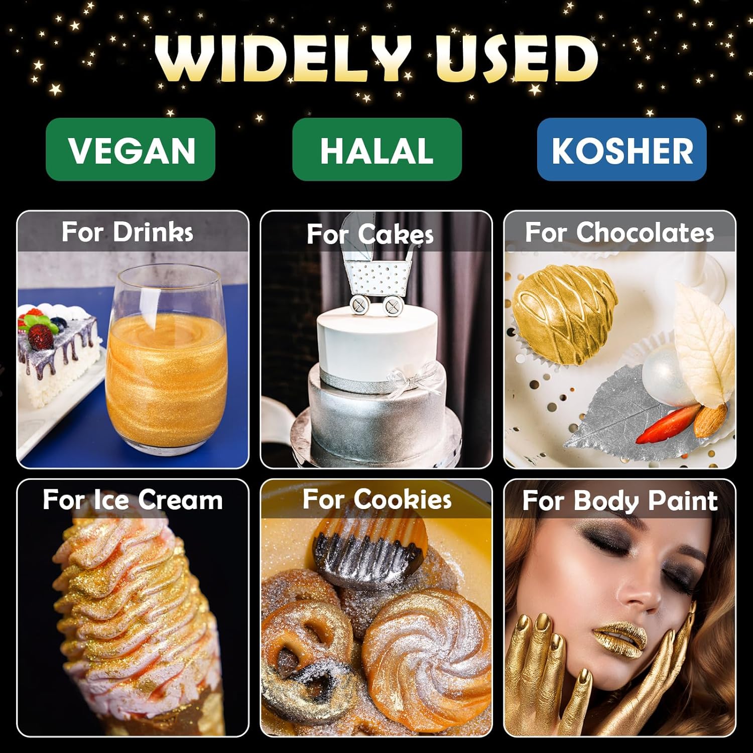 - 🌟【Vegan & Allergen-Free】Food-grade glitter uses only the highest quality vegan ingredients and does not contain common food allergens, including gluten, nuts or dairy products, so everyone can use and enjoy this product regardless of diet or food allergies. Unlike food contact glitter, these are 100% edible, so you don't need to worry about using them in your creations to make them sparkle for all.