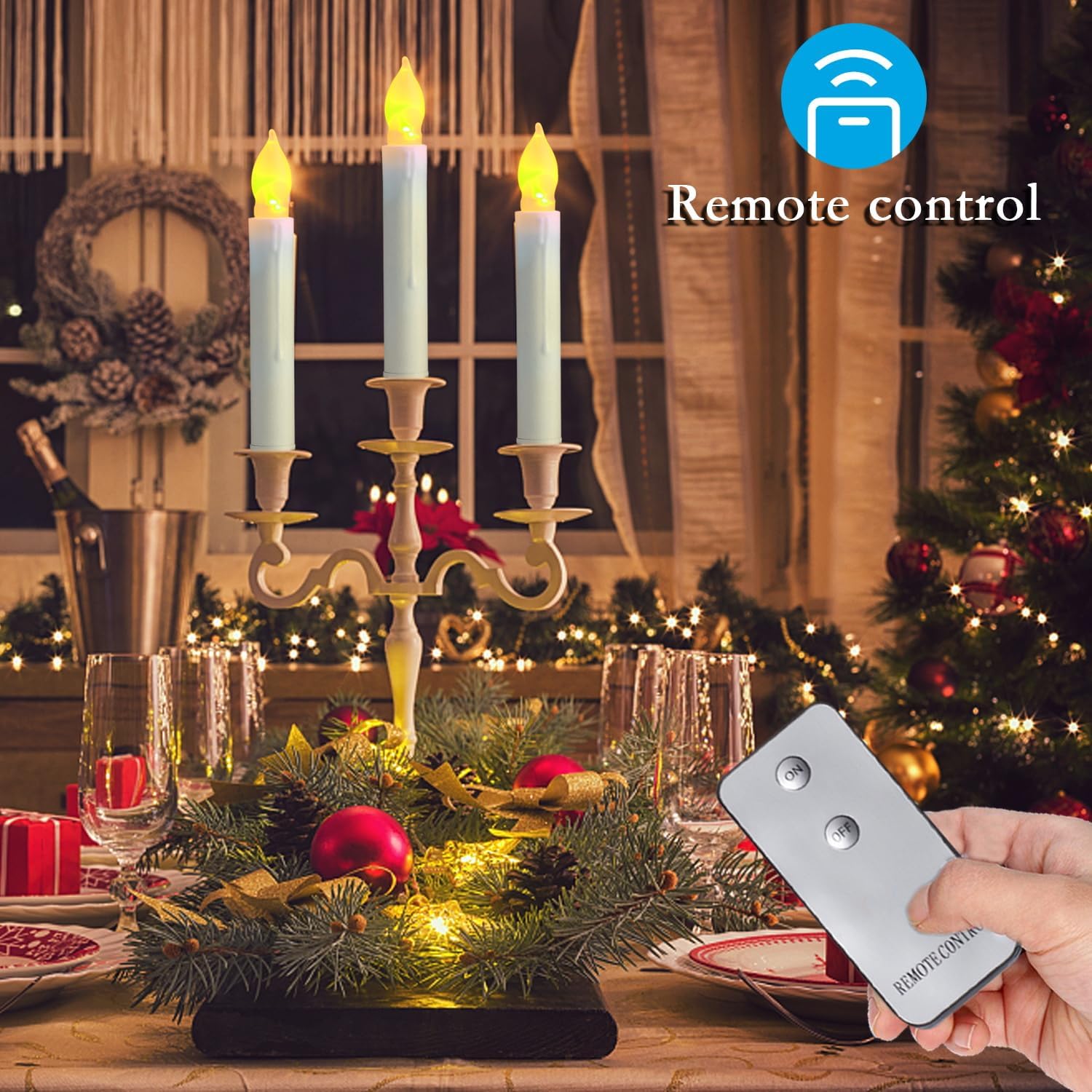 - IDEAL DECORATION -This pack have 12 realistic batteries operated taper candles and one remote. They have warm white flicking flame and dripping wax design. Perfect for Movie themed party, dinner table, church service, birthday, wedding, fireplace, Halloween decorations,Christmas decoration. The surprise is that you can hang candles floating from the ceiling with fishing lines(Not included) to create an effect of “floating candles”