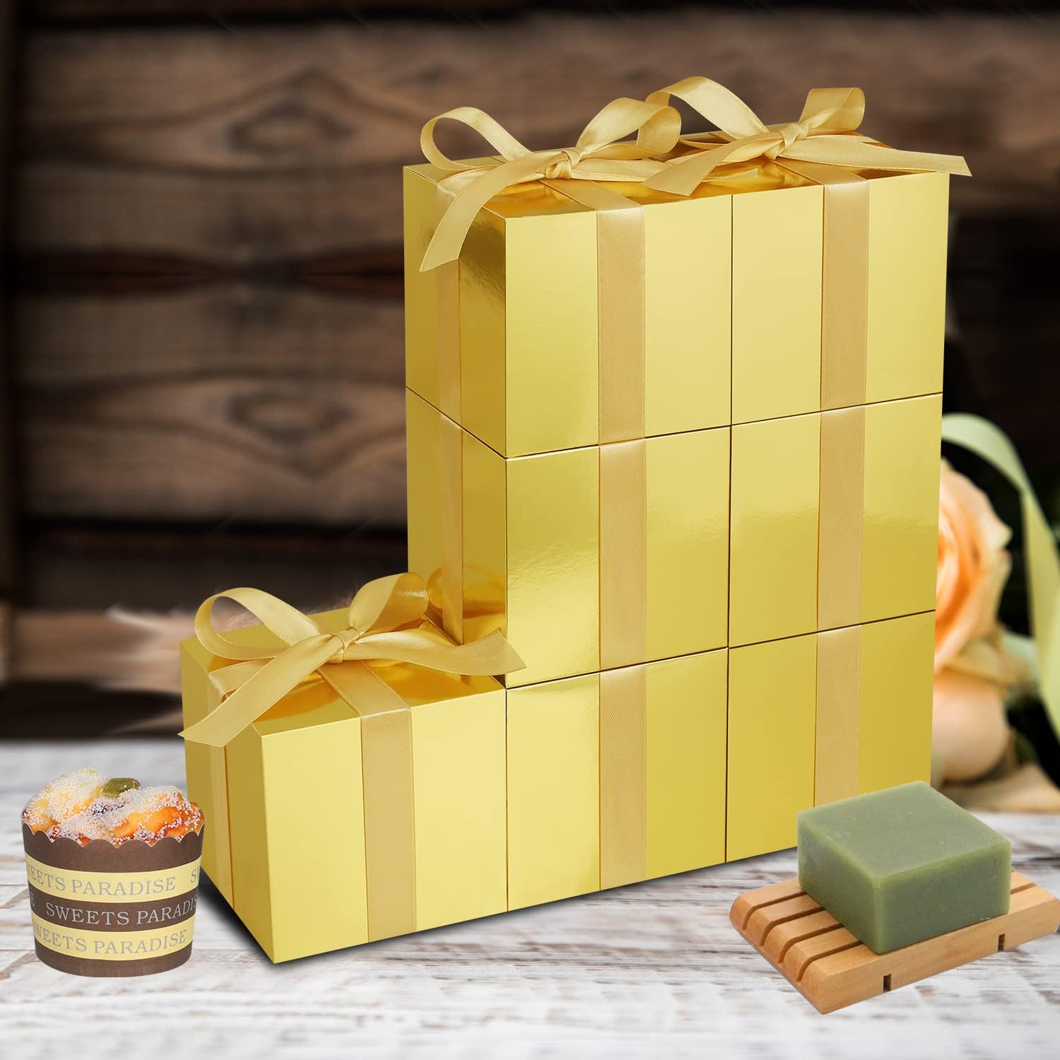 - Size Information: Candy box size is 4x4x4 inch Inches,cube shape, It is already equipped with ribbon and blank tag to complete the outside classy gift looks. Gold favor boxes are applicable to store candies, chocolates, cookies, cupcake, mugs, shot glasses, candles, bath bombs, soaps, perfumes, makeup, jewelry, or other small gift.