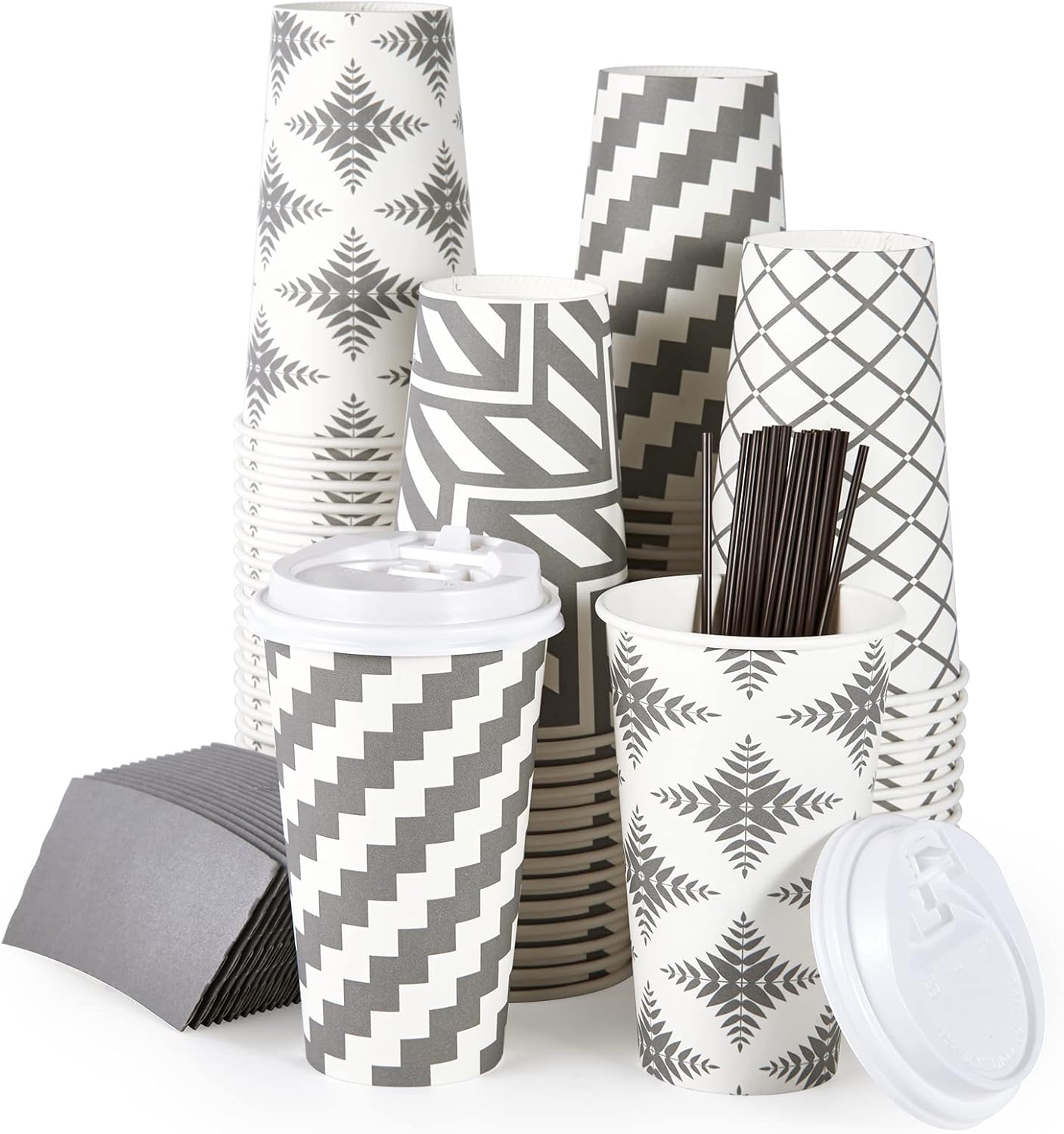 - Great Value Pack: You will receive a pack of 100 16 oz disposable cups, including 100 cups in four grey designs, 100 white lids, 100 grey cup sleeves, and 100 straws