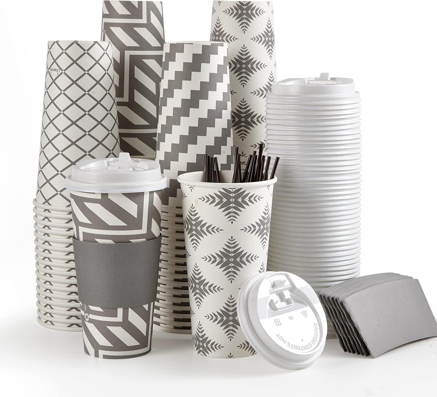 LITOPAK 100 Pack 20 oz Paper Coffee Cups with Lid, Sleeve, and Straws, Four Designs of Disposable Hot Coffee Cups for Home, Stores, and Cafes