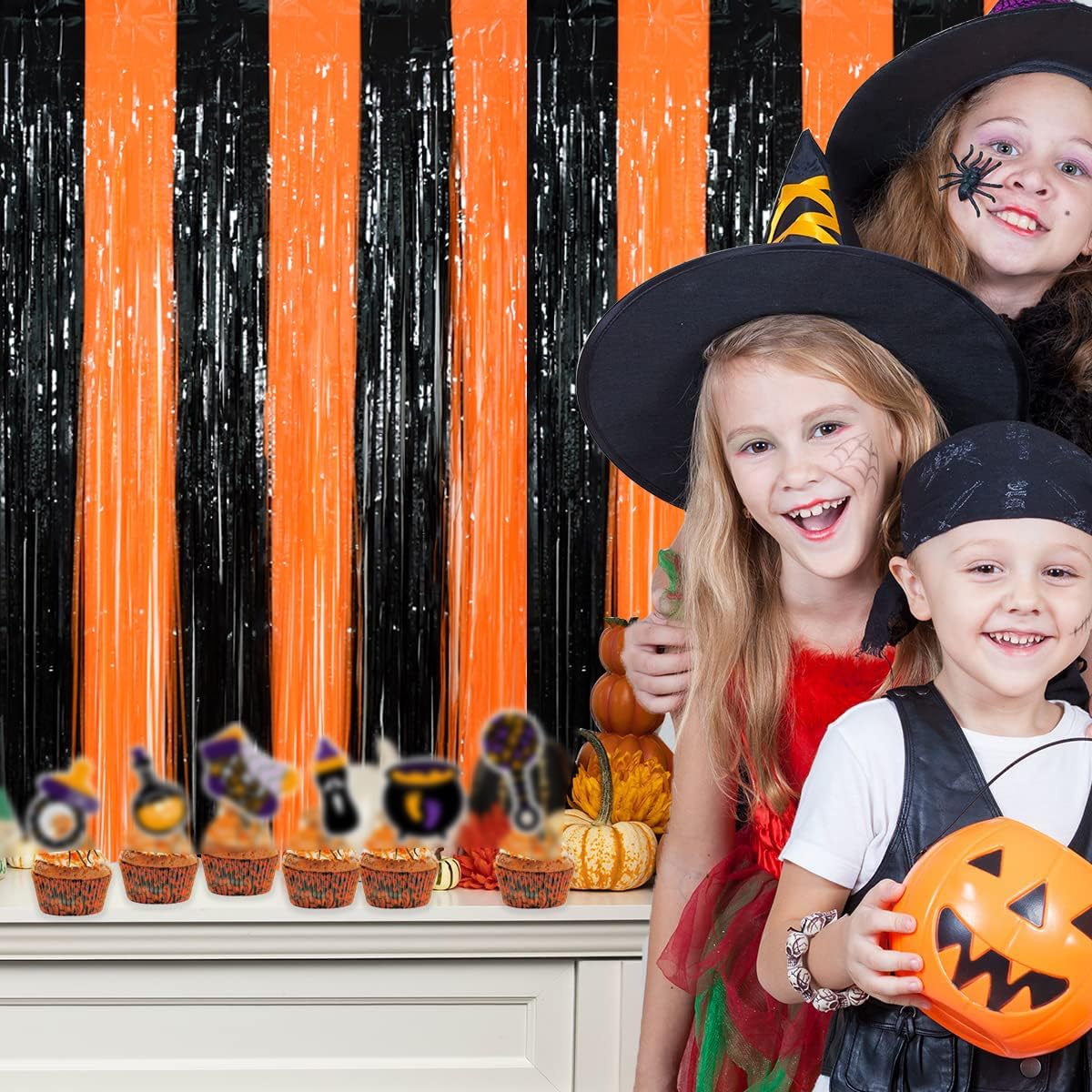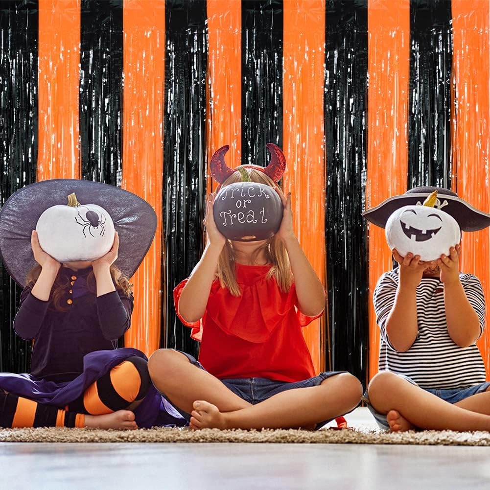 TONIFUL 2Pcs Black Orange Door Streamers,Photo Booth Backdrop Metallic Streamers Foil Fringe Curtains for Birthday,Christmas,New Year,Bachelorette,Halloween Party Streamers Decor(9.9ft x 6.6ft)