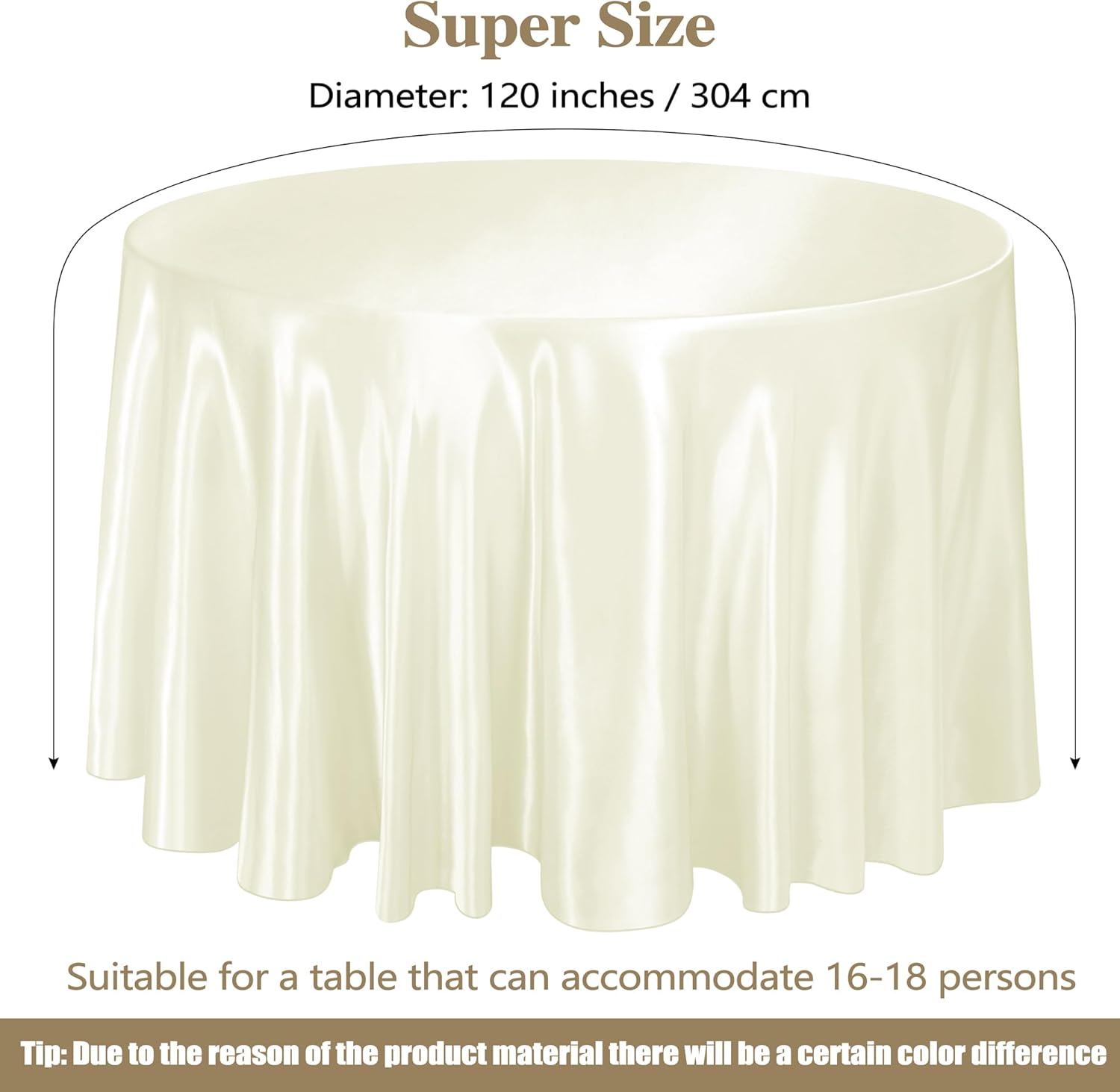 - Super size: our ivory round satin table cover measures about 120 inches / 304 cm, large enough to decorate a table that can accommodate 16-18 persons; the beautiful design will instantly heighten the elegance of your table, a great choice for your gatherings; Tip: Due to the reason of the product material there will be a certain color difference