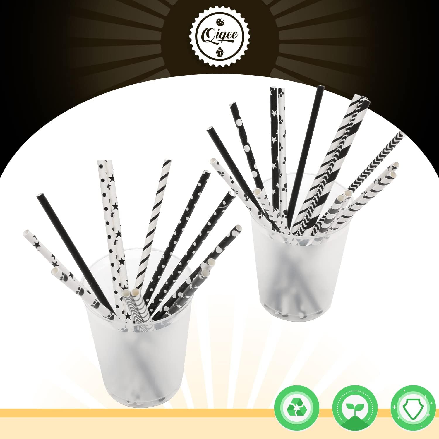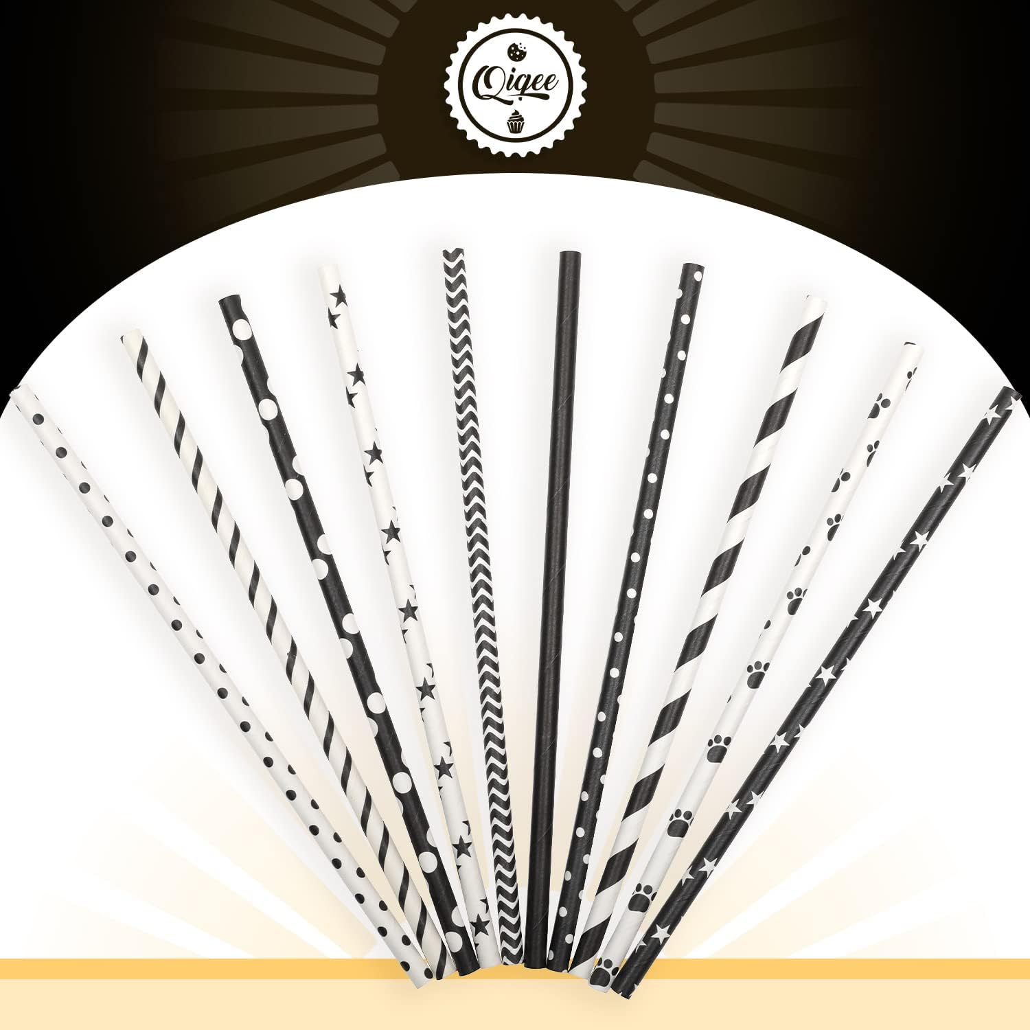 qiqee Black Paper Straws 150pcs Disposable Straws Bulk (10 Black Patterns, Biodegradable, Disposable, 7.75 x 0.25 inches)