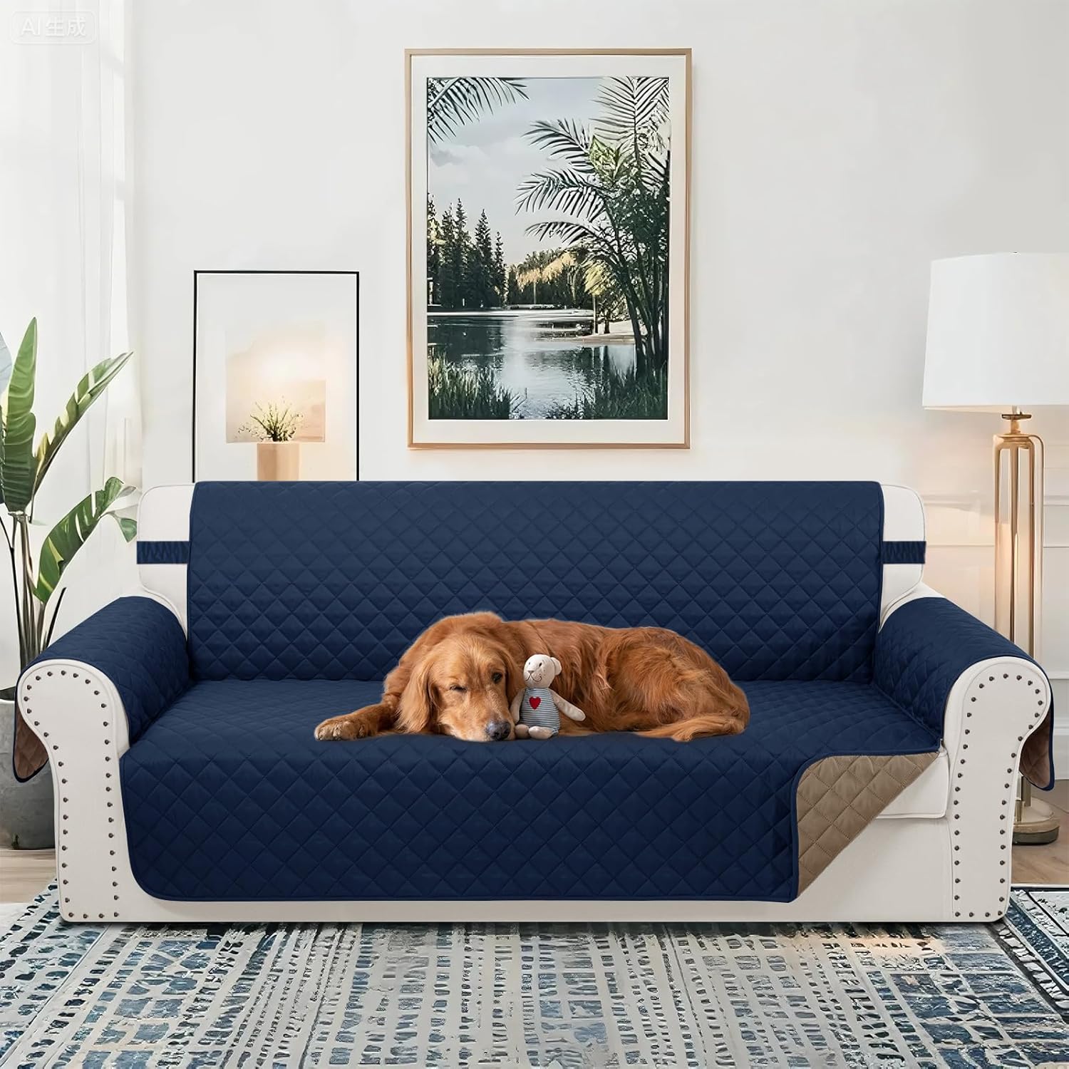 Reversible Sofa Covers Couch Cover Furniture Protector for Dogs Elastic Straps Water Resistant(Sofa,Navy/Camel)