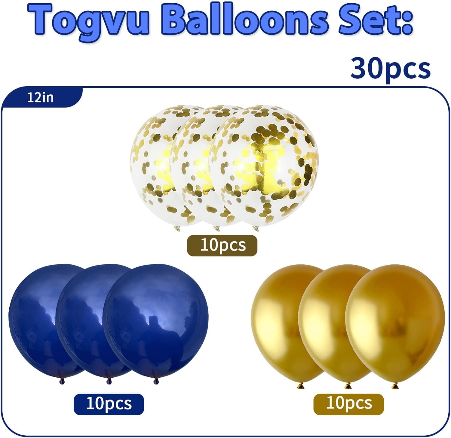 - đăNavy Blue Gold Balloons SetăYou will get 3 different colors of 12 inch balloons, metallic gold 10 pcs, transparent navy blue 10 pcs, gold confetti 10pcs, total 30 pieces, with 1pc blue balloon ribbon.