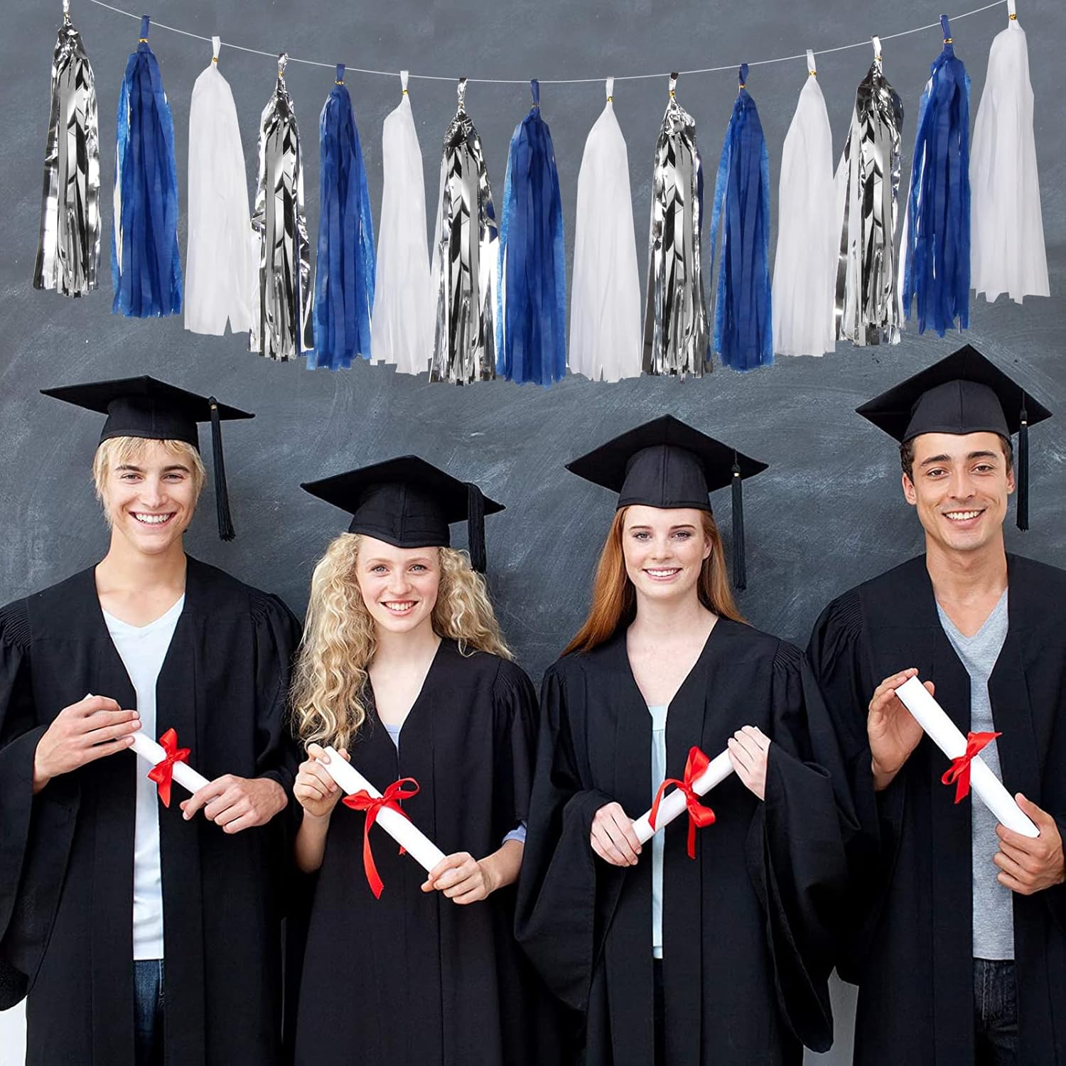 - 【Garland includes】15 tassels,5pcs navy blue tassel garland, 5pcs white tassel garlands, 5pcs silver tassel garlands. Each tassel is about 14" long after assembled. And each garland comes with a 10ft long free String for hanging these tassels.
