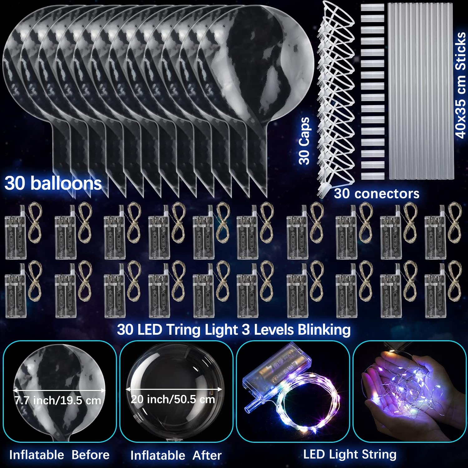 - Included Components : 30 glow bobo balloons, LED strings light, 60 sticks, connectors