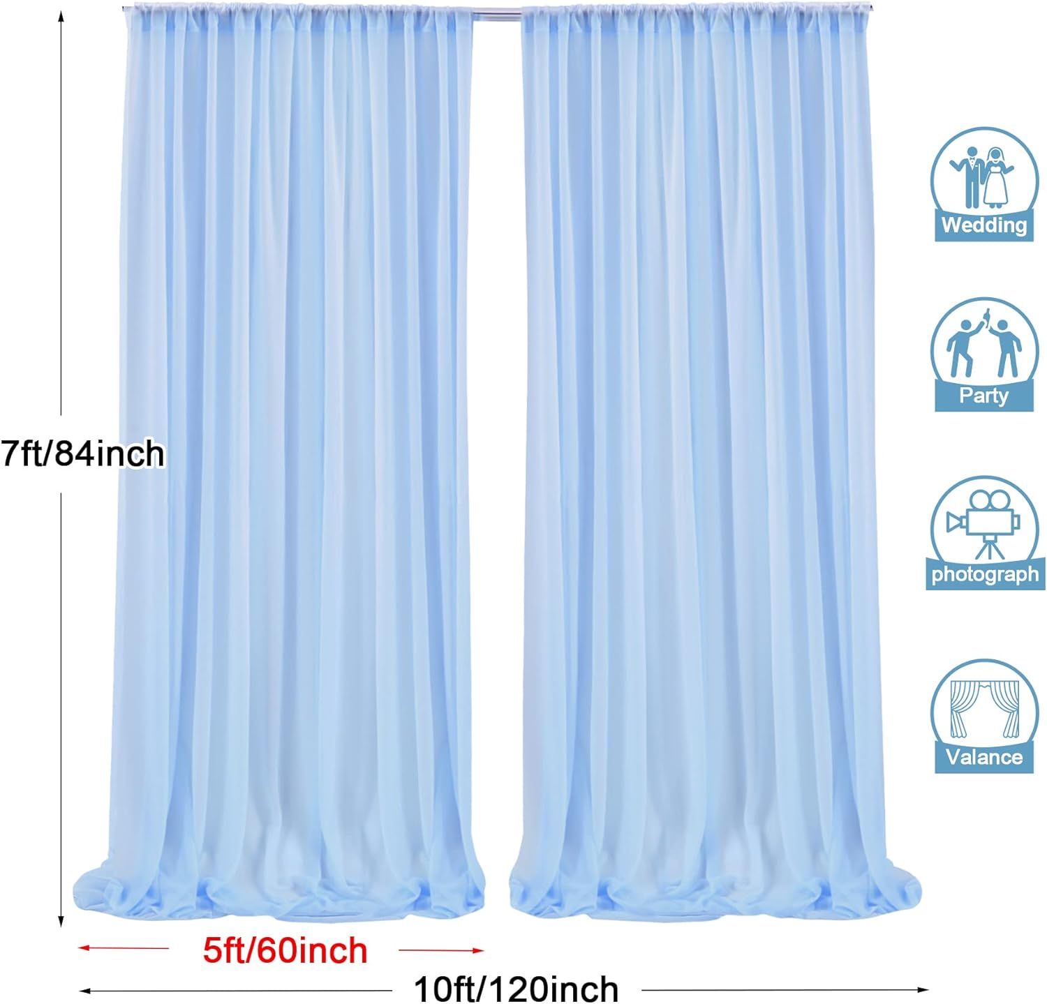 - 2 Panels Backdrop Drapes: Come with 2 panels Blue chiffon backdrop curtains,each panels size is 5ft width and 7ft height. Combined, entire backdrop curtains is 10ft*7ft. Please note: Not including the background stand