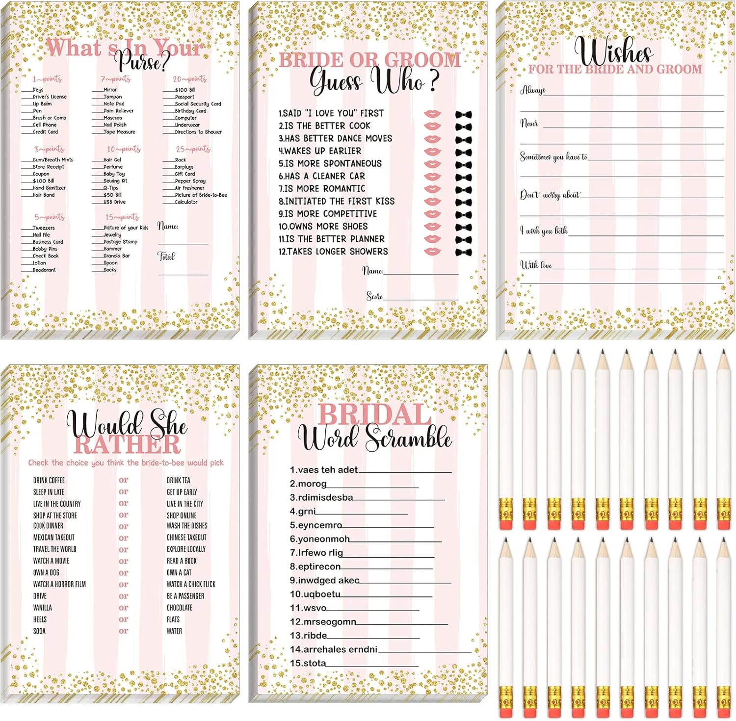 - 5 Styles of Fun Bridal Shower Games: our game bridal shower cards contain 5 fun games, including "Would She Rather", "Bride Or Groom Guess Who", "Bridal Word Scramble", "Wishes For The Bride And Groom", "What's In Your Purse"; These cards provide your guests with a fun wedding game to help them fully enjoy the party and elevate the mood