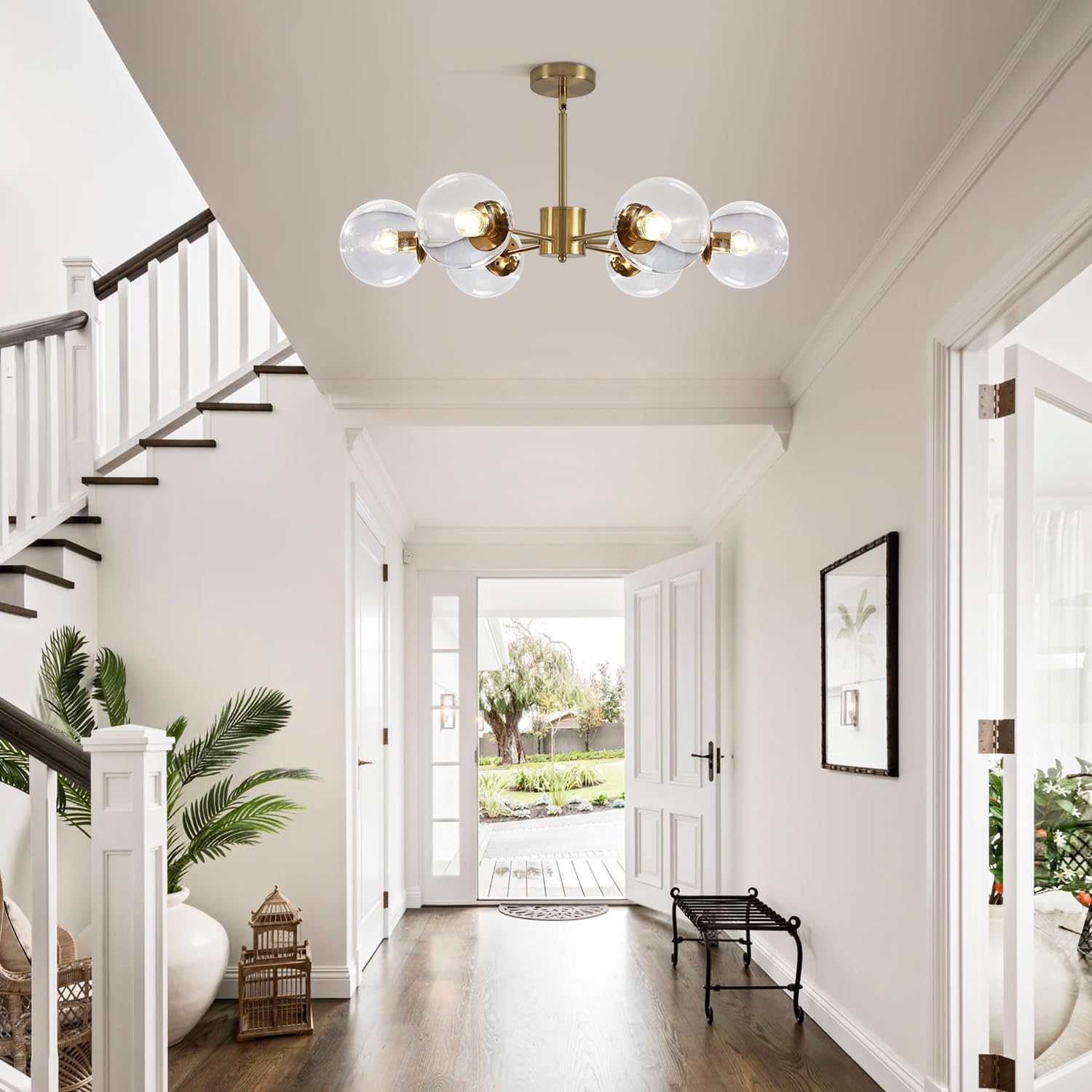 KCO Lighting Modern 6-Light Sputnik Chandelier with Clear Glass Globe Mid Century Adjustable Ceiling Pendant Light Gold Brass Flush Mounted Fixture