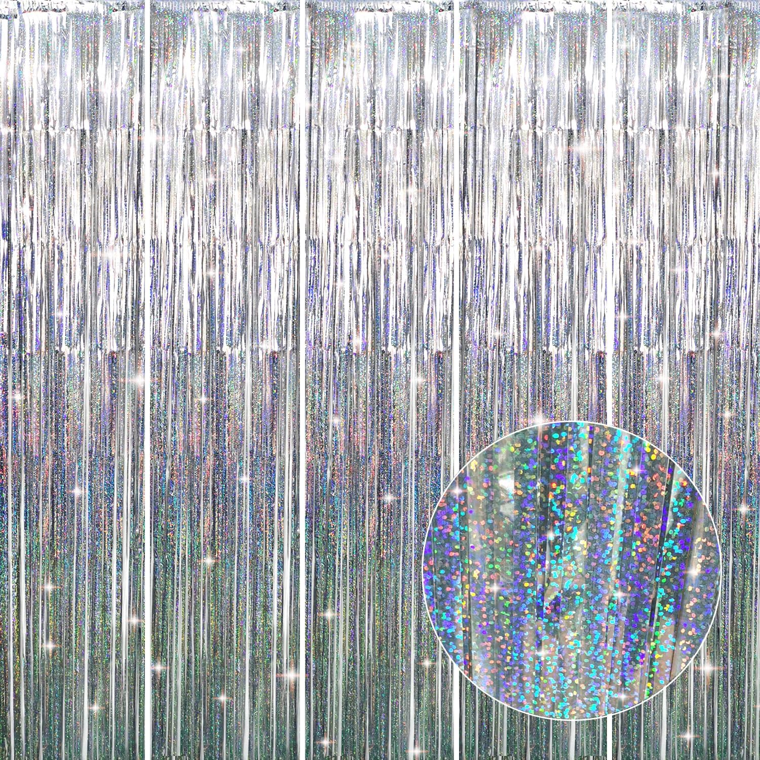 - Package Includes:5 pack shiny silver foil fringe curtain,3.2 ft x 8.2 ft each,suitable for hanging on a door or coverage a wall fully