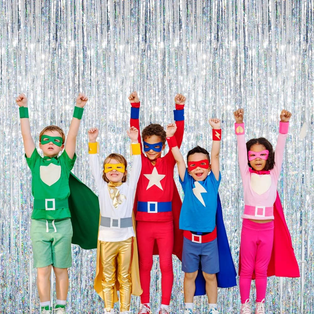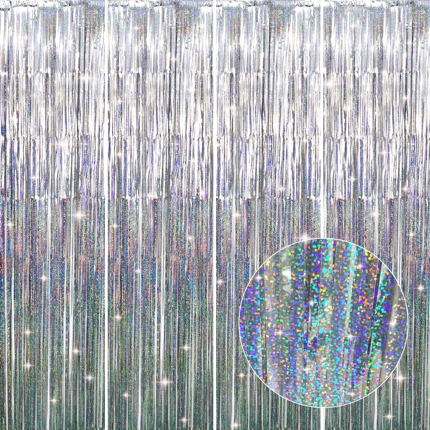 - Package Includes:4 pack shiny silver foil fringe curtains,3.2 ft x 8.2 ft each,suitable for hanging on a door or coverage a wall fully