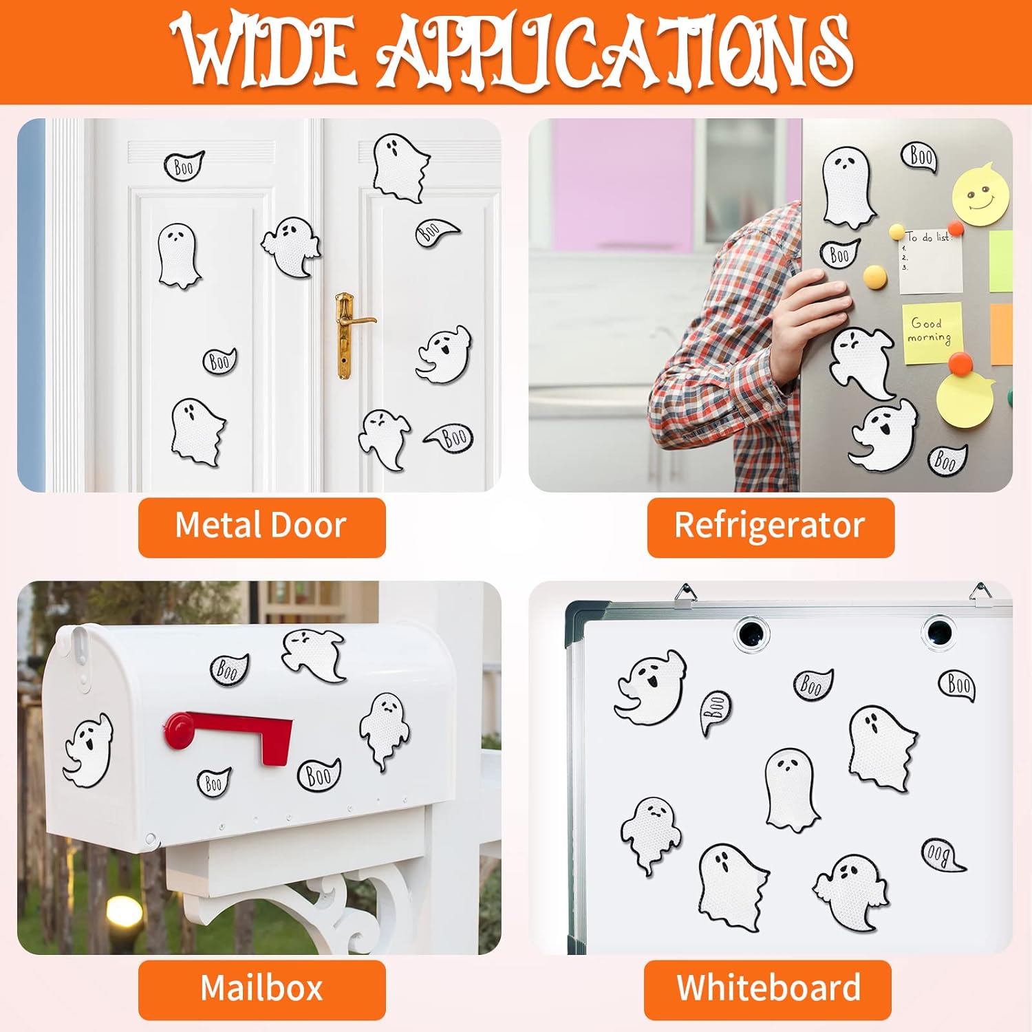- Holiday theme: these garage door magnets decorations adopt holiday as the theme, containing classic images of ghost, as well as the word [Boo] in the dialog box shaped sticker, and they are reflective, which also can create a spooky atmosphere even at night
