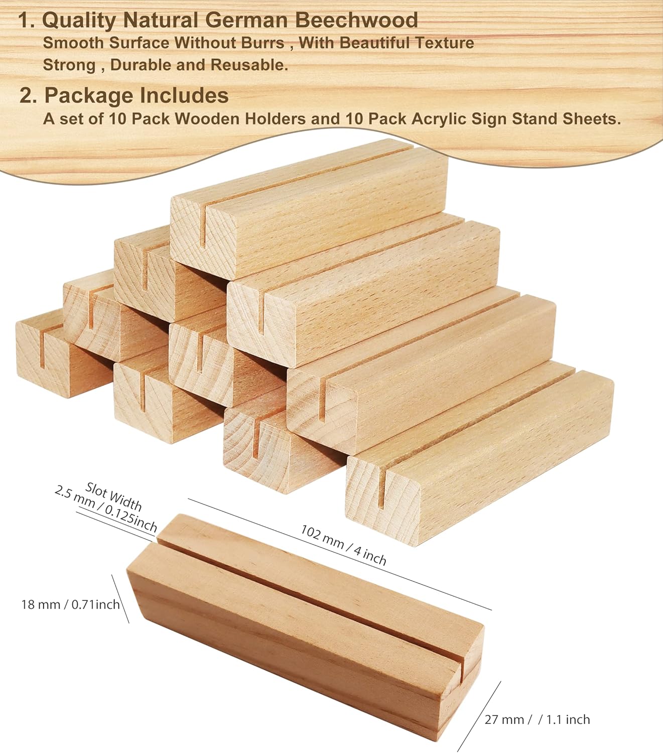 - Perfect Match - The package contains 10 pcs clear blank arch acrylic wedding signs and 10 pcs wood sign stands. Each acrylic sign measures 102x152x2mm / 4x6 inches, 1/8 inch thick,and each wood stand measures 102x28x20 mm / 4x1.1x0.8 inches. Each acrylic pieces have a protective film on both sides to prevent scratches and when you are ready to use it, you should peel it off.