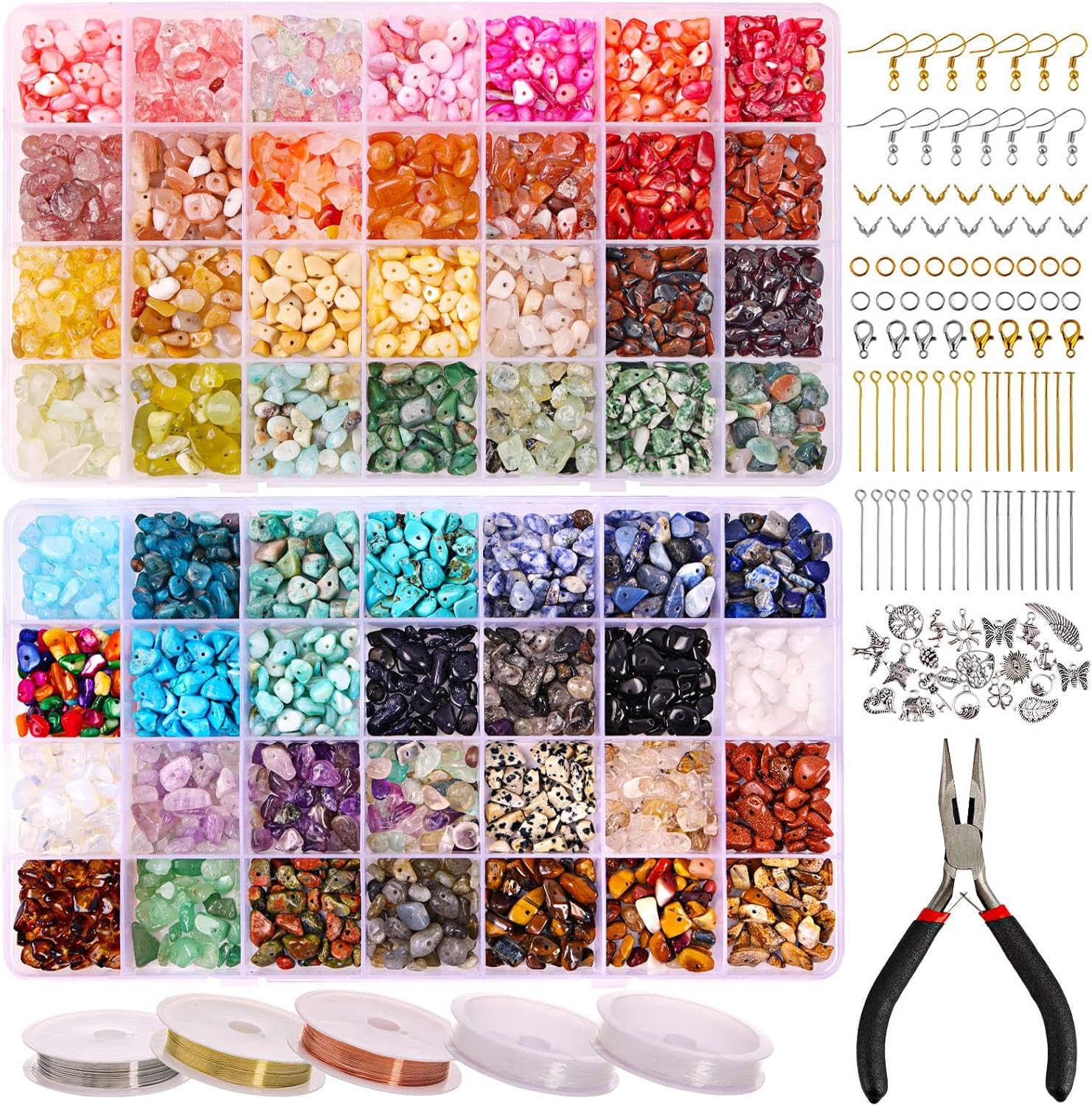- Wide Use: The Crystals Beads Jewelry Making Kit includes 56 brightly colored gemstone chip beads, and all the necessary tools and accessories for DIY bracelets, necklaces, earrings, rings, and more to create a unique style. It can also be used to make crafts and home decorations, making it the perfect gift for family and mates for a holiday or birthday.