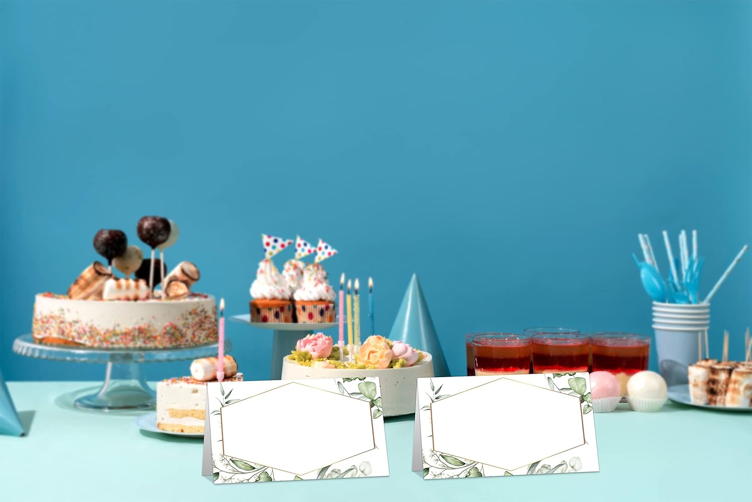 Gold Foil Greenery Table Place Card, 25 Pcs Tent Style Cards Set with Green Eucalyptus, Editable Name Cards for Table Seating, Food Lables for Birthday Party, Baby Shower, Wedding, Bridal Shower(12)