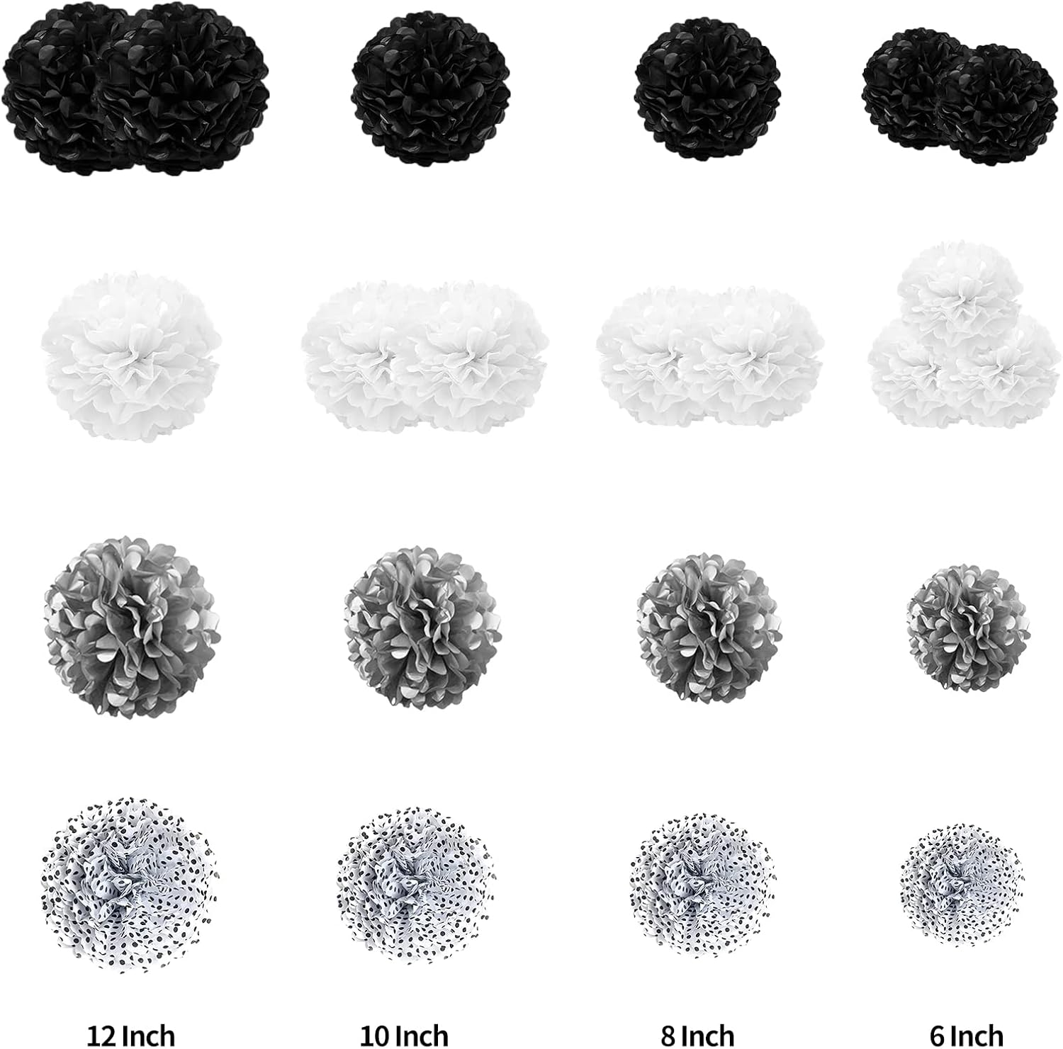 Tissue Paper Pompoms Paper Flower 22 Pcs Black,Silver, Polka Dot, White Paper Flower Ball for Birthday Bachelorette Wedding Baby Shower Bridal Shower Party Decoration