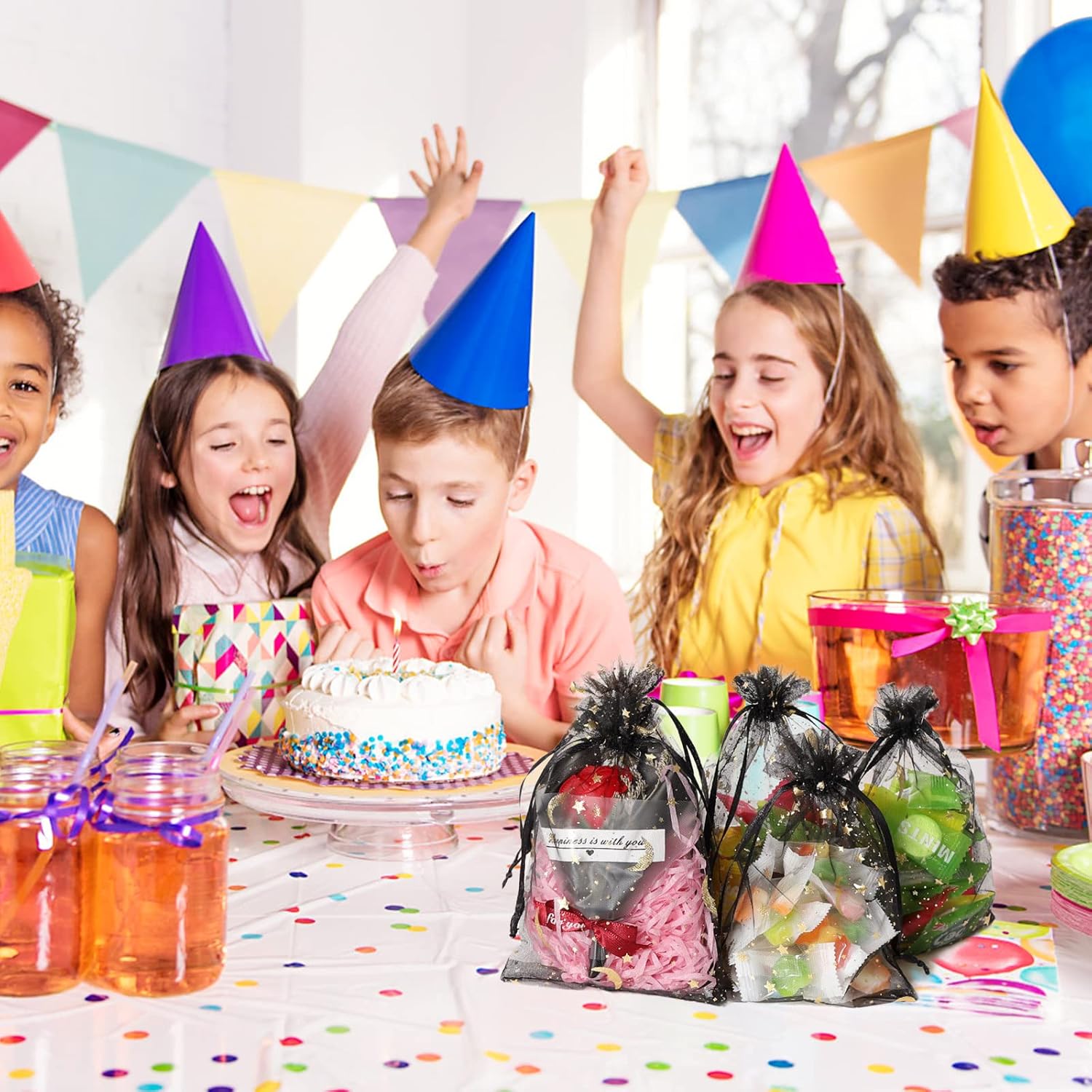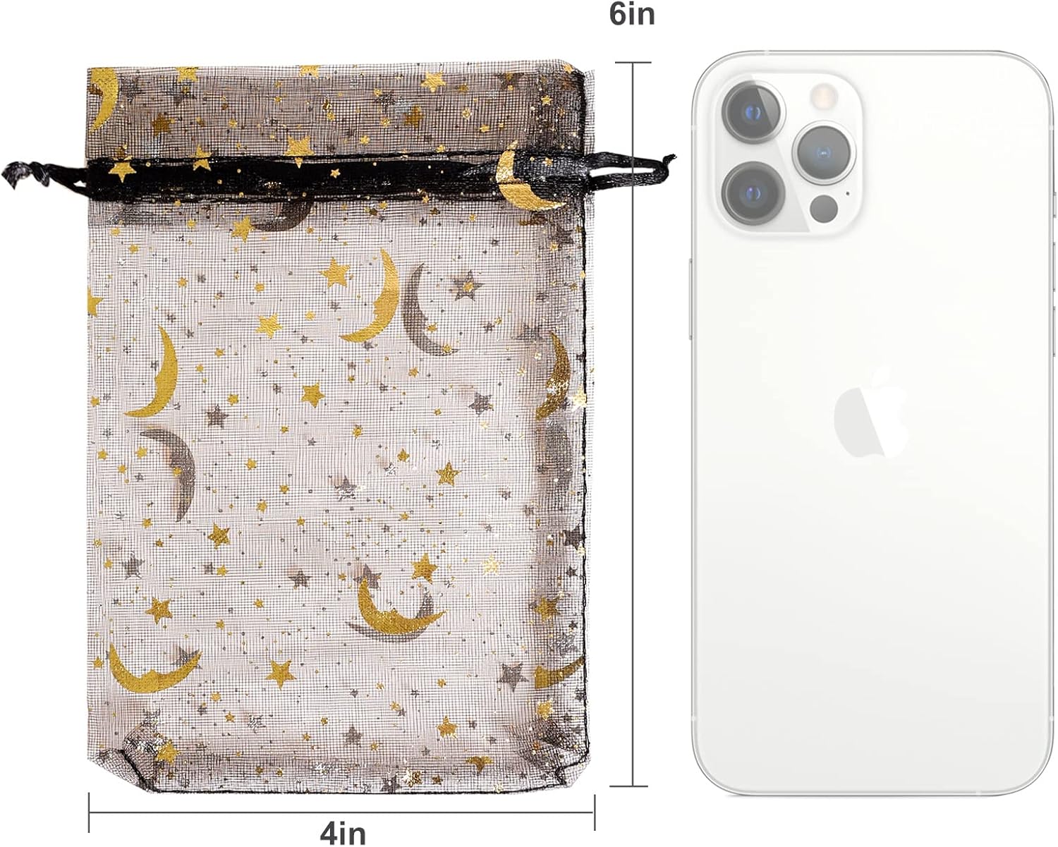 100PCS Moon Star Organza Bags - 4x6" Wedding Favors with Drawstring, Black Organza Gift Pouch for Jewelry, Wedding, Valentine's Day, Christmas, Eid Mubarak Party Favor Bags
