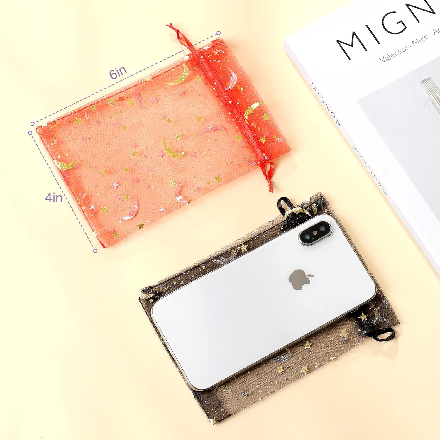 100PCS Moon Star Organza Bags, 4x6" Wedding Favors Bags with Drawstring, Mixed Color Little Mesh Candy Gift Pouches for Party, Jewelry, Christmas, Festival, Eid Mubarak Party Favor Bags