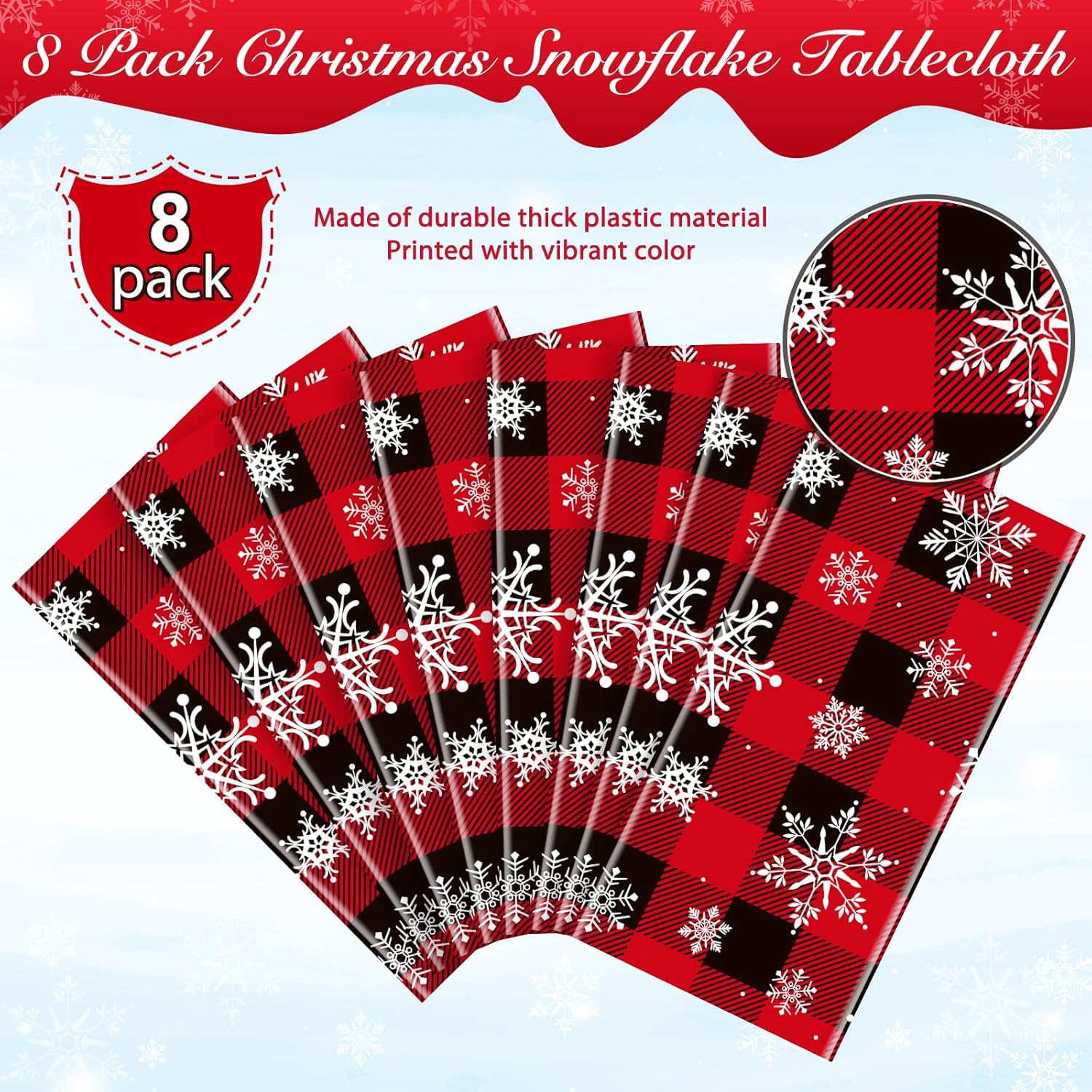 - What will you receive:8 pieces rectangular Christmas party tablecloth,all over printed with white snowflake pasterns on bright red and black buffalo plaid backdrop,ideal for decorating your winter Christmas holiday party supplies and decorations