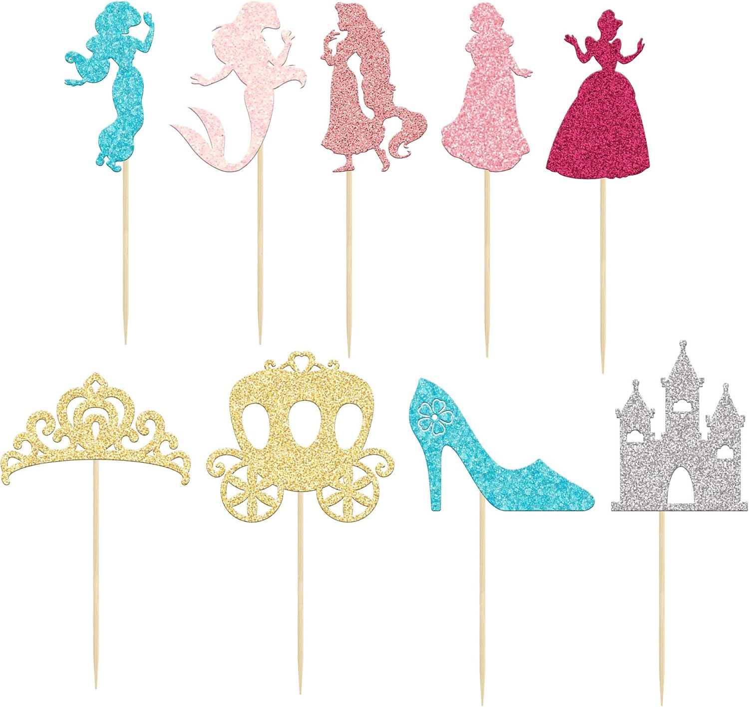 Gyufise 36Pcs Princess Cupcake Toppers Colorful Glitter Mermaid Girl Castle Carriage High Heel Crown Cupcake Picks Princess Theme Baby Shower Girls Birthday Party Cake Decorations Supplies