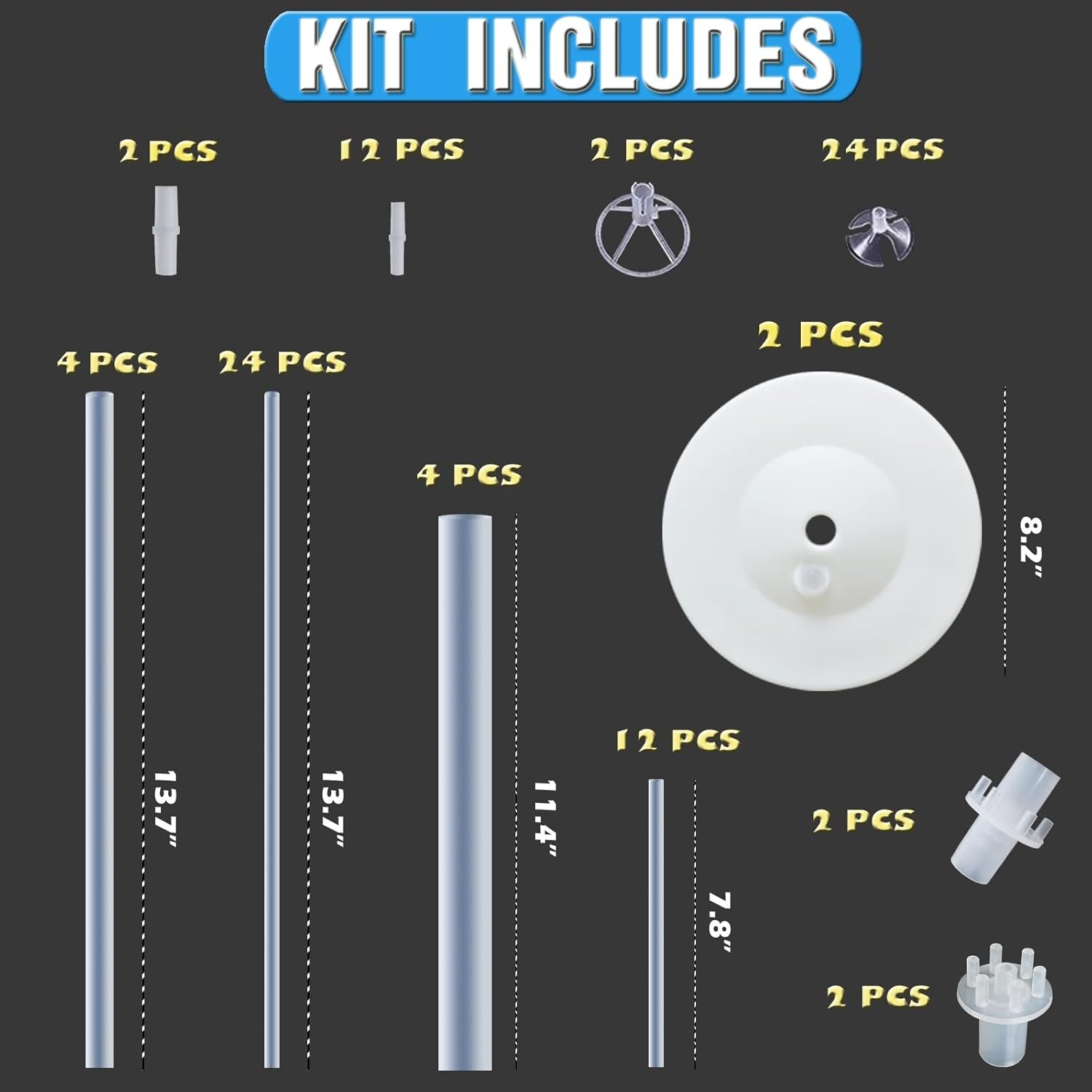- âșBALLOONS ARCH KIT INCLUDES - 2 sets of balloon stand kits, includes 44 unconnected balloon sticks, 24 cups, 2 big cups, 4 of which are tube connectors, 12 mini union joints,2 union joints,28pcs balloons,2 base.Each balloon stand comes in 2 different height sizes can useful.Perfect Size for Table&Ground.