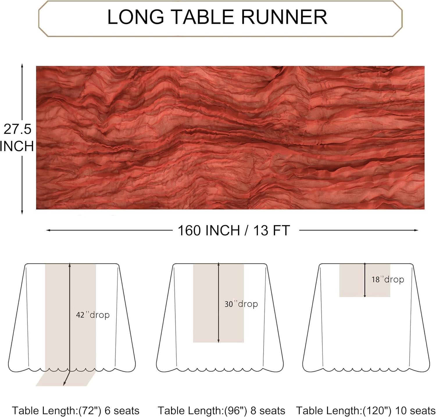 - LONG RUST TABLE RUNNER PACKAGE: 6 pcs extra long rust cheesecloth table runner bulk 27.5" wide and 160"/13 feet in length. All ends are finished, durable. It can satisfy your daily use for most tables and drapes beautifully on table. Terracotta cheesecloth table runner looks absolutely gorgeous as centerpiece table runner or fall wedding party decorations
