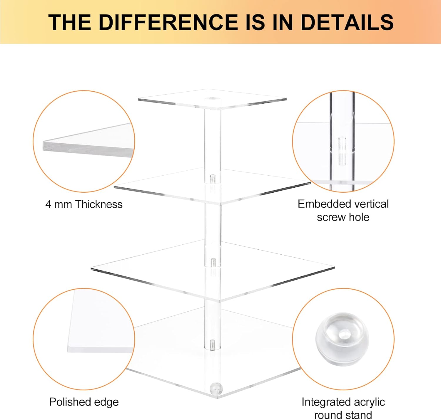 - ♛[Solid & Stable]--- Using acrylic rod with screws embedded instead of hollow tube to protect the middle support from damage and stand straight and stable. The new integrated acrylic base rods make the whole cake stand look more elegant and crystal clear while also helping to lift from the ground perfectly without the use of screws.