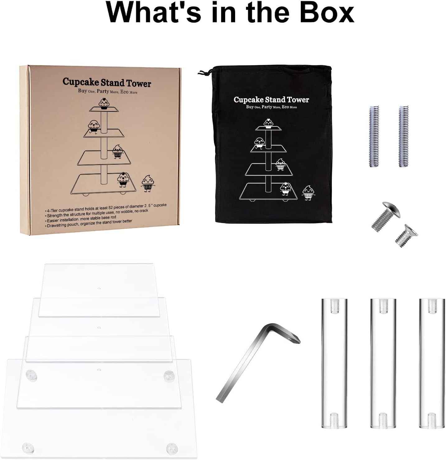 - ♛[STRUCTURE]--- Overall size 15.3 x 12 inch (high x wide). The diameter of 4 tier plates : 6'', 8'', 10'',12'' and the height between each plates: 4.7'' to provide enough space and height to showcase your cake and dessert. Each acrylic plate can be assembled freely or removed to be 3 or 2 tiers. Bonus designed drawstring pouch bag could be used to easy storage and environmentally friendly recycling.
