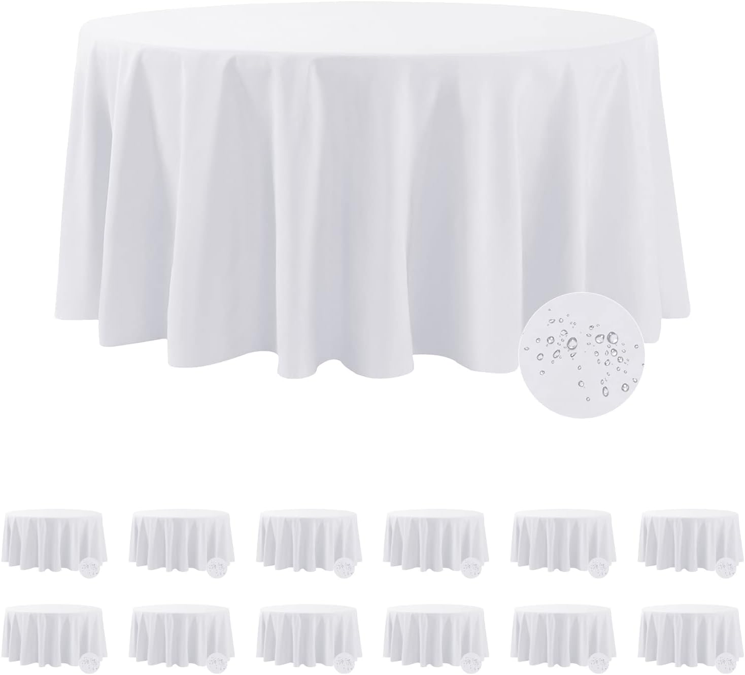 Fokitut 12 Pack Waterproof Round Tablecloth, 132 Inch, Stain Resistant and Wrinkle Polyester Table Cloth, Fabric Table Cover for Kitchen Dining, Wedding, Party, Holiday Dinner-White
