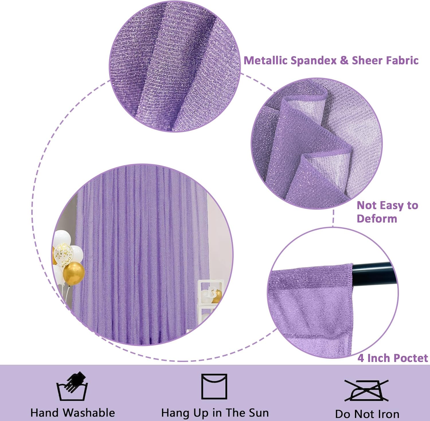 - [Stretch Backing + Shiny Polyester Thread] The lavender purple backdrop is made of spandex sheer fabric woven together with shiny polyester thread that has a slight stretch. The surface has a delicate metallic shimmer, which gives a high-class reflective effect when taking photos and easily enhances the splendor of the scene.