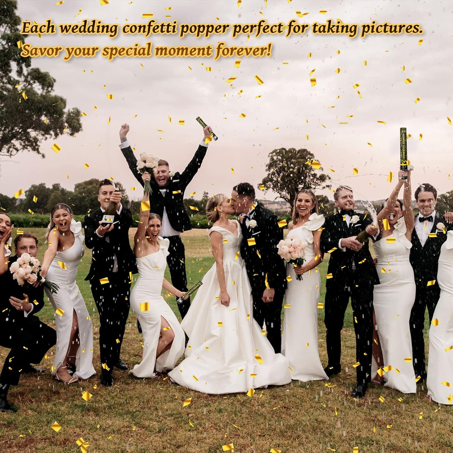 - Party Poppers with Gold Confetti - Our goldl mylar confetti poppers are made of high quality confetti, ensuring a celebartion that's both fun and safe. Ideal for any occasion, form weddings and engagements to birthdays and anniversaries, graduation Christmas New Year party.